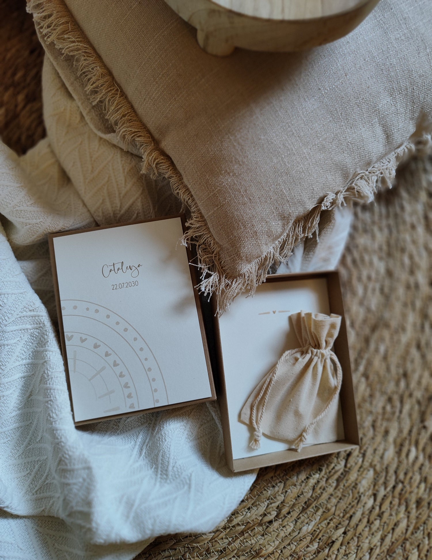 Mit der kleinen Geschenkbox kannst du unsere mini 1x1 Karten schick & personalisiert verpackt verschenken. Einfach das Baumwollsäckchen aus der Box nehmen und die mini 1x1 Karten hineinlegen.