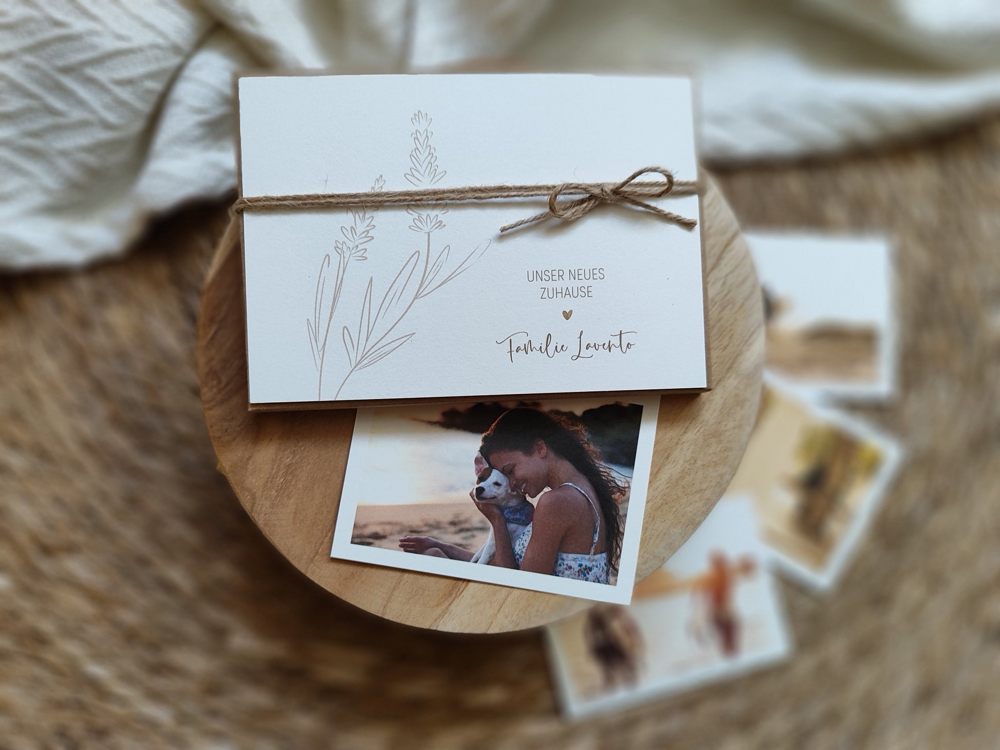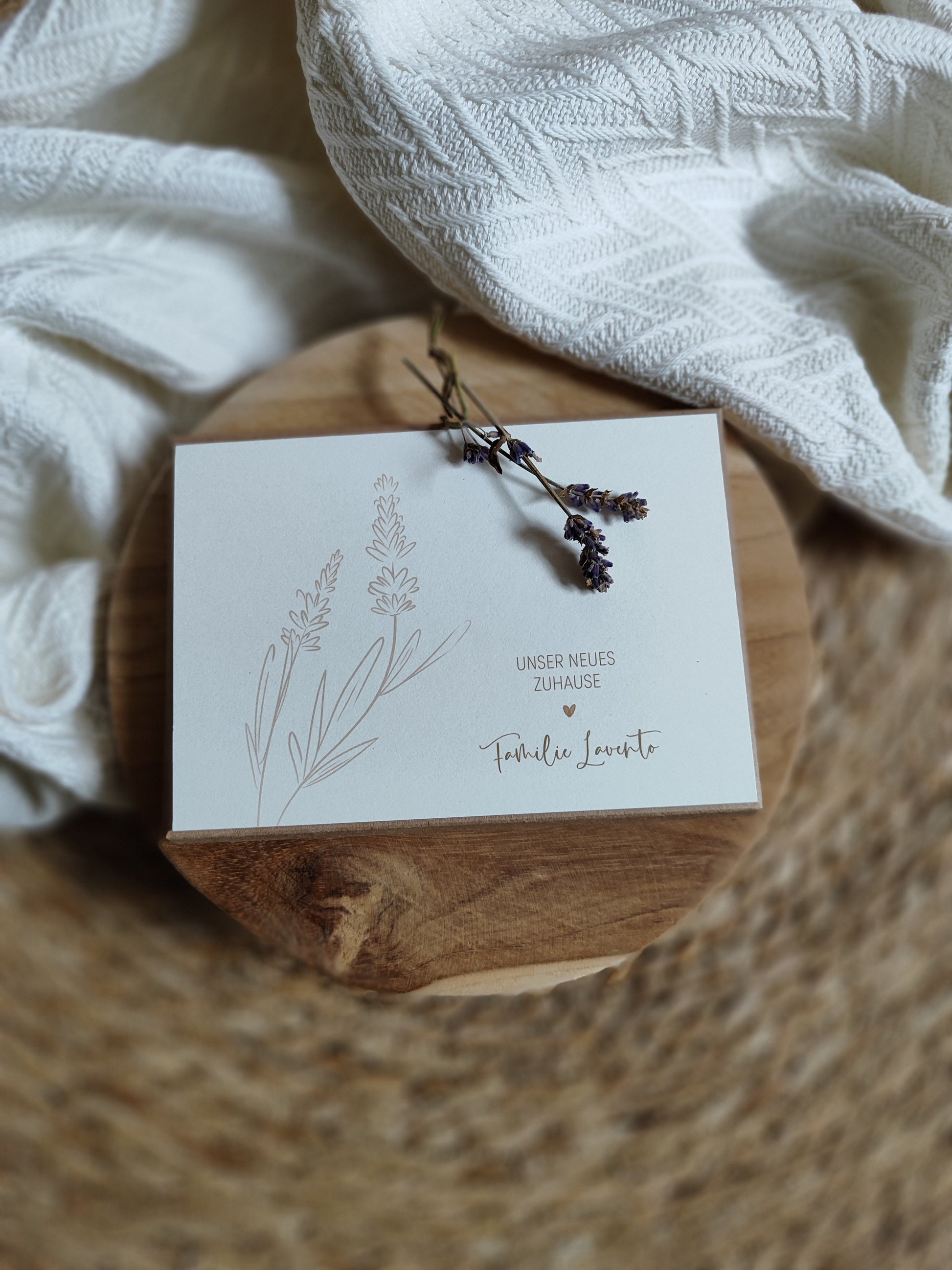 Die hochwertige Karte aus 300g/m² Strukturpapier in zartem Creme Ton verleiht dem Motiv eine edle Anmutung und angenehme Haptik. Die leichte Struktur und warme Farbe unterstreichen den besonderen Charme der Illustration.
