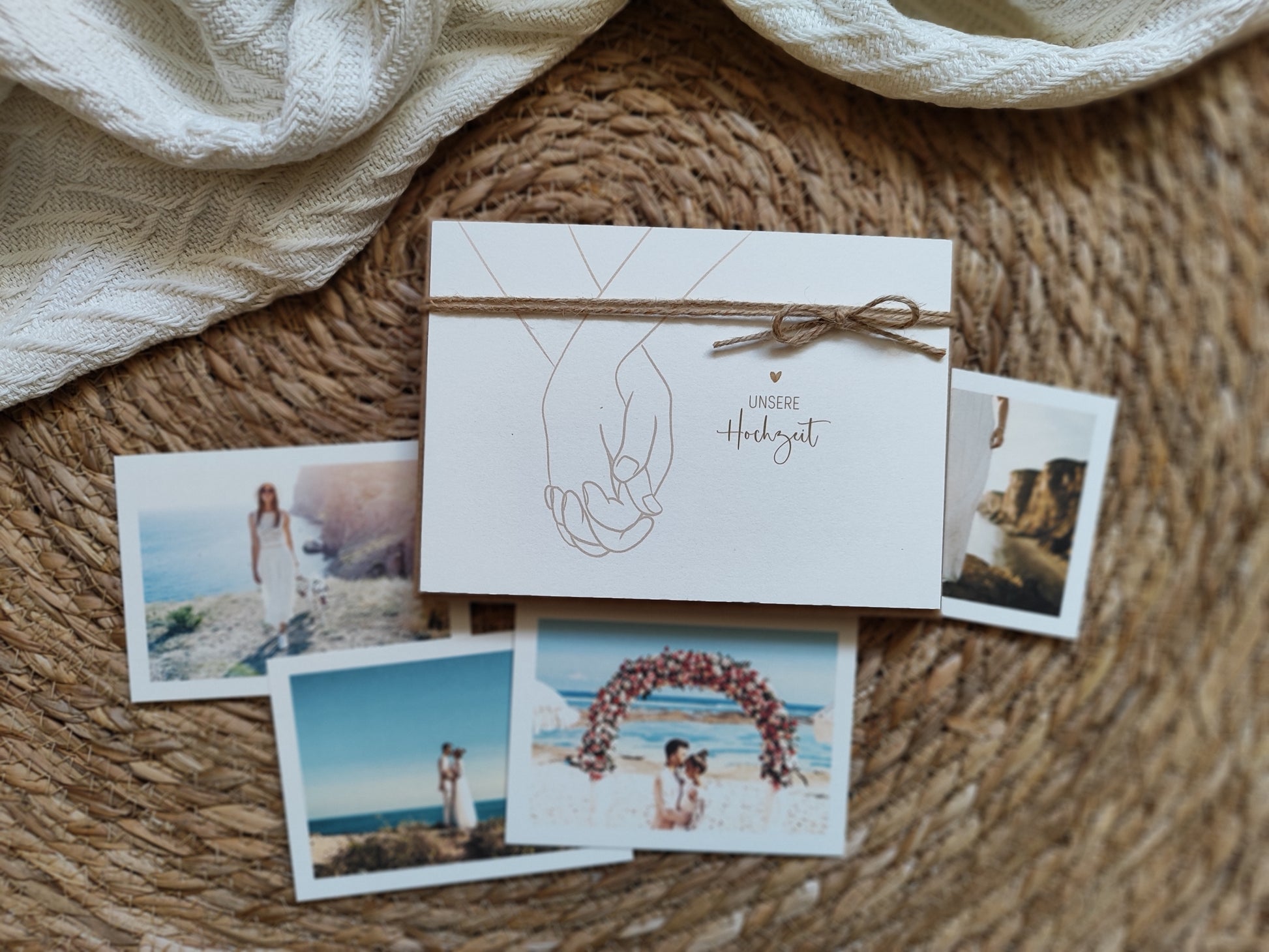 Fest angebracht auf einem stabilen Umschlag aus Kraftkarton, bietet die Fototasche Platz für die Highlights der Hochzeit im Fotoformat 10,5 x 14,8cm. So bleiben die schönsten Momente stilvoll aufbewahrt und können immer wieder in Erinnerung gerufen werden.