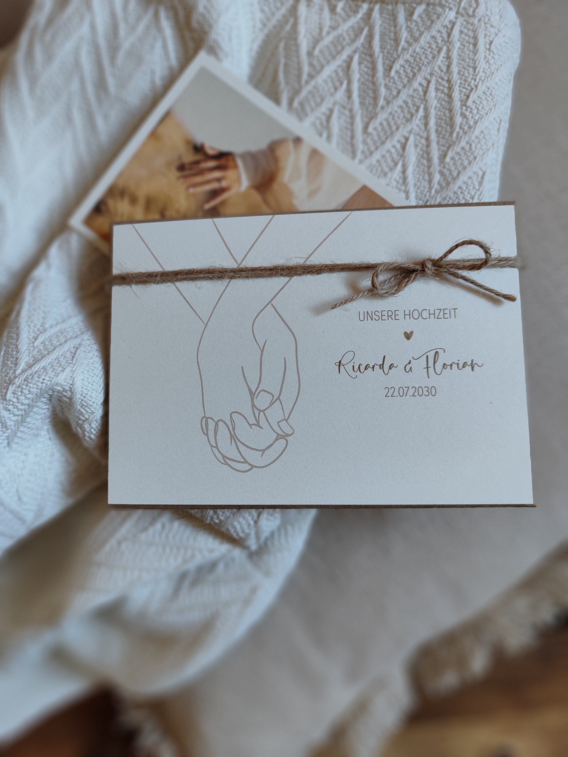 Ein natürliches Band und der charmante Herzchen-Verschluss runden das liebevolle Design ab und betonen die Verbundenheit des Brautpaares.