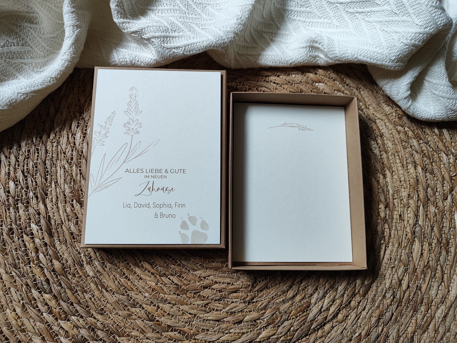 Die Karte in der Box ist herausnehmbar und bietet Platz auf der Vor- und Rückseite für einen eigenen Text.