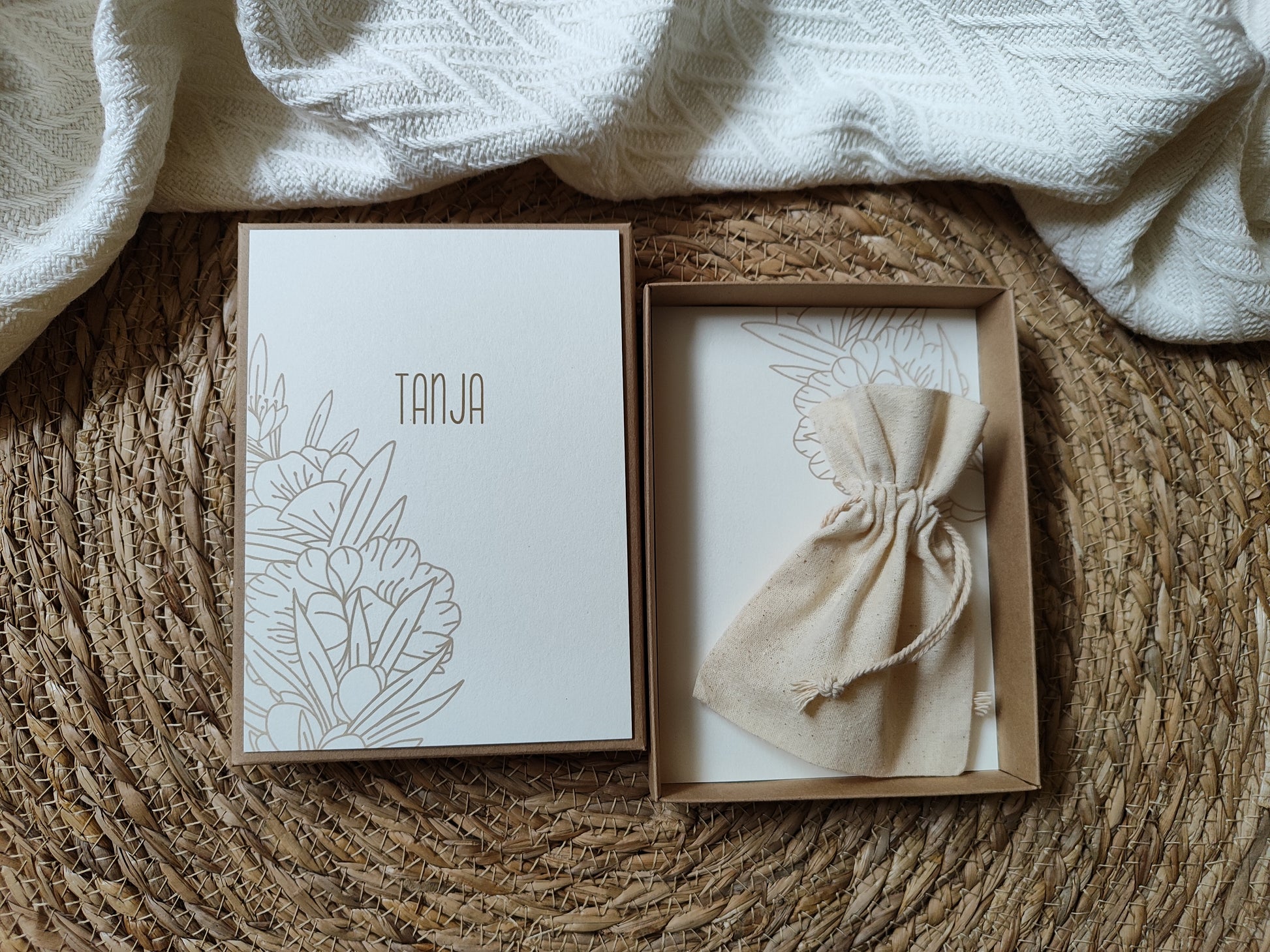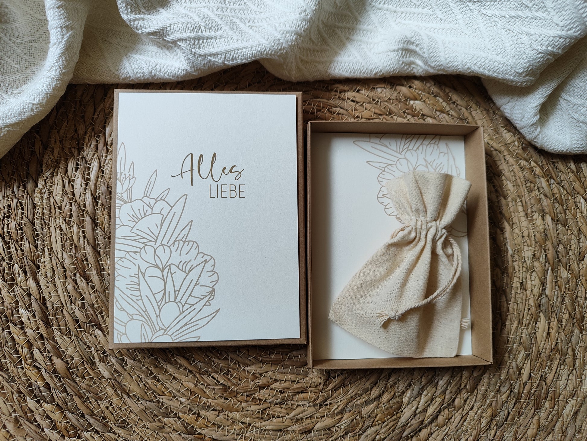 Die Karte in der Box ist herausnehmbar und bietet Platz auf der Vor- und Rückseite für einen eigenen Text.