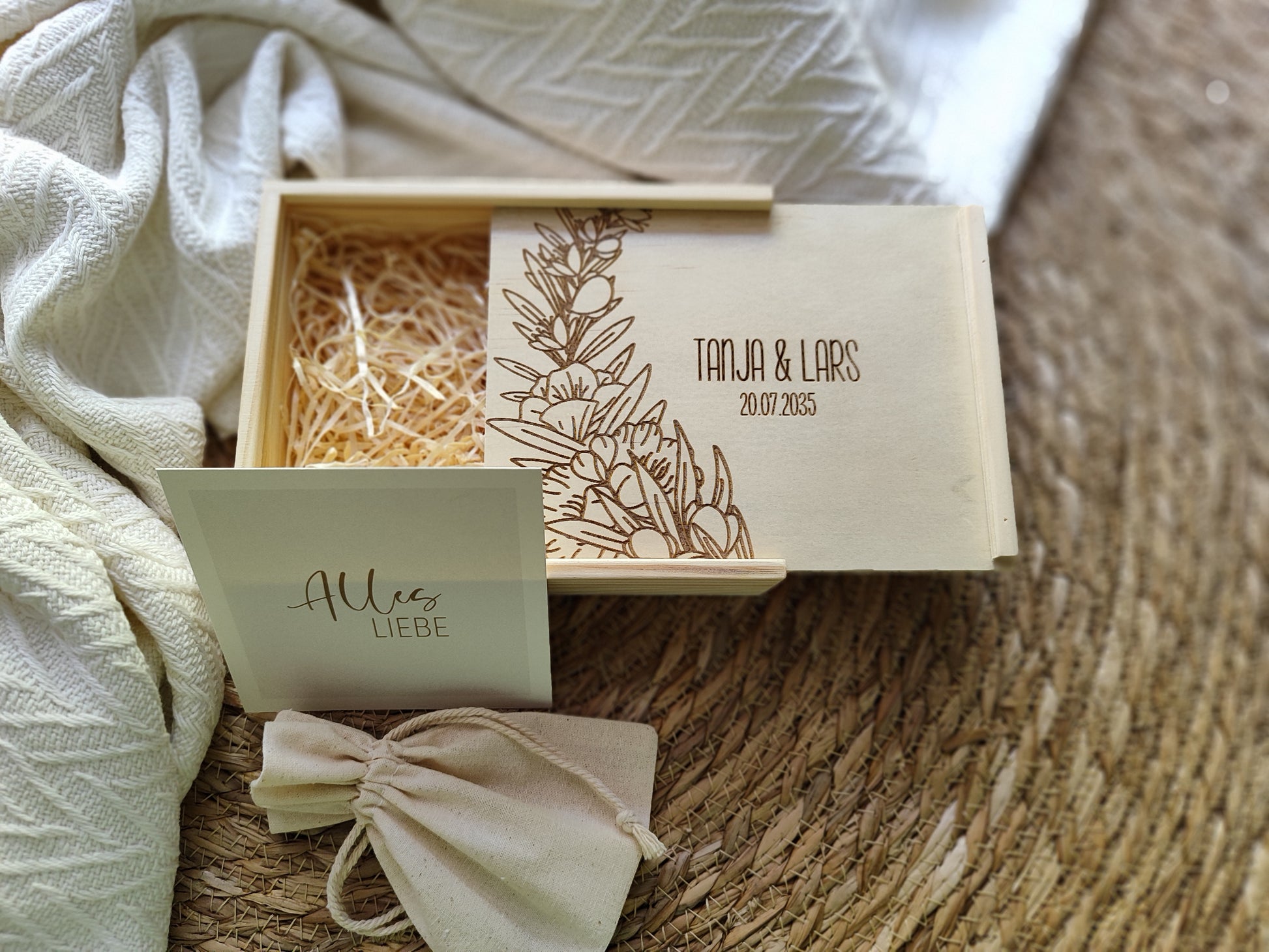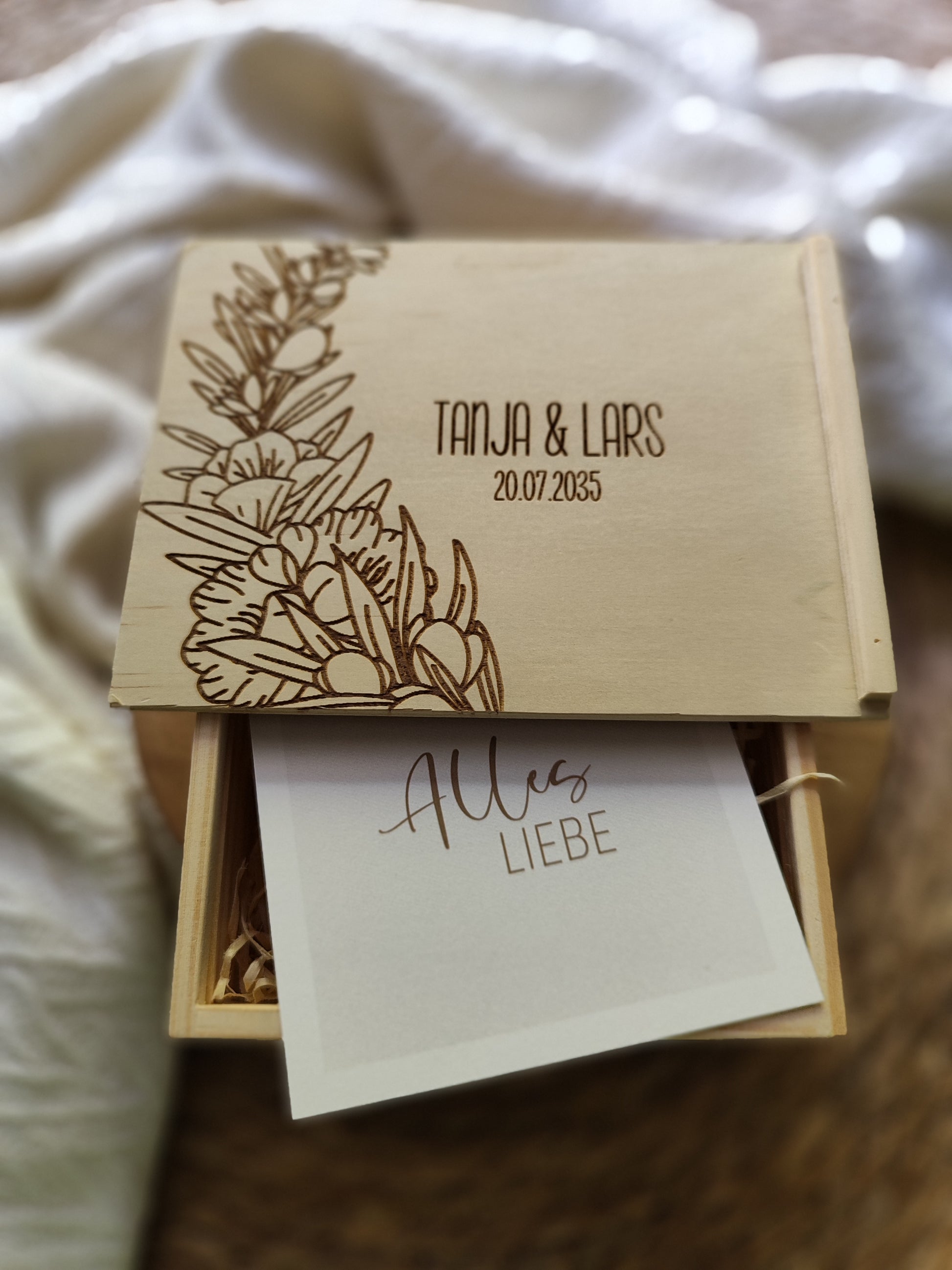 Du verschenkst nicht einfach nur eine Box, sondern ein echtes Unikat. Jede einzelne entsteht aus natürlichem Kiefernholz und ist durch ihre individuelle Maserung, Farbgebung und kleine Asteinschlüsse einzigartig. Deine Personalisierung und unsere eigenen liebevollen Illustrationen machen sie zu einem besonderen Einzelstück mit bleibendem Wert.