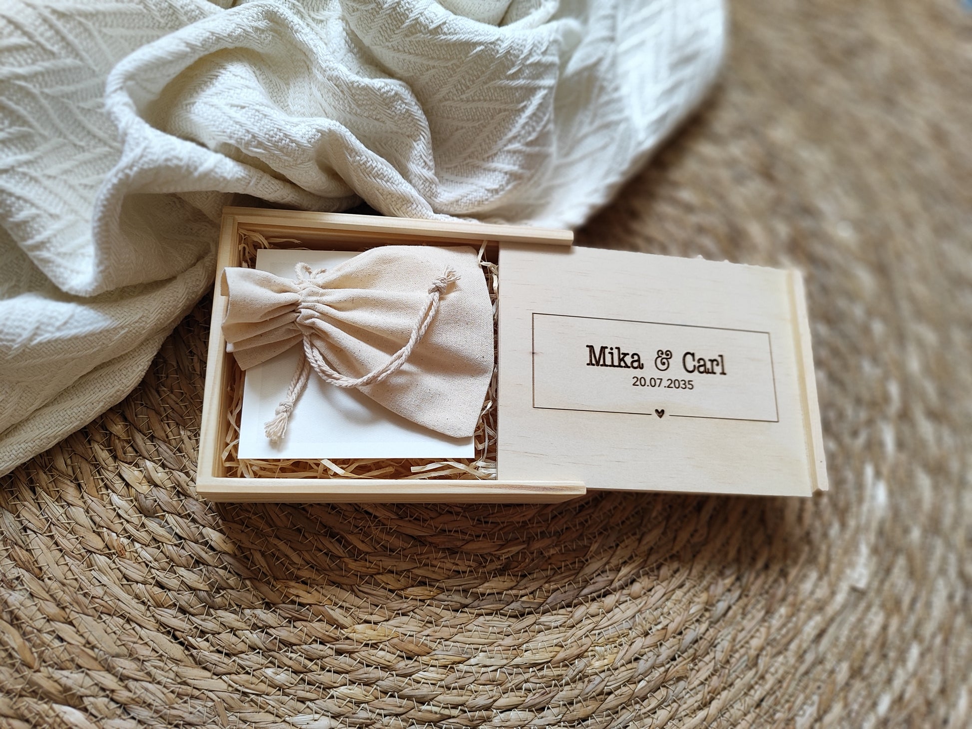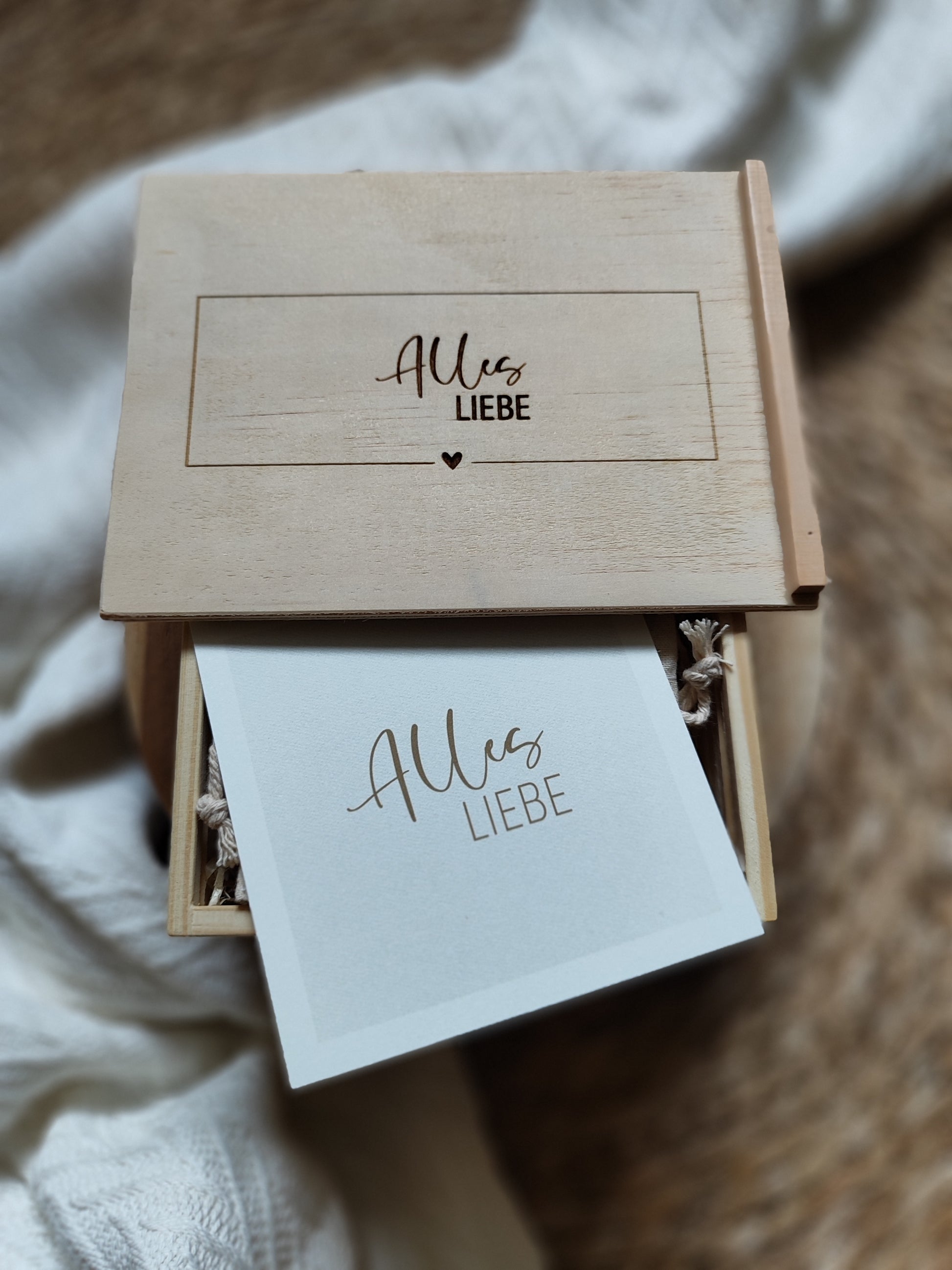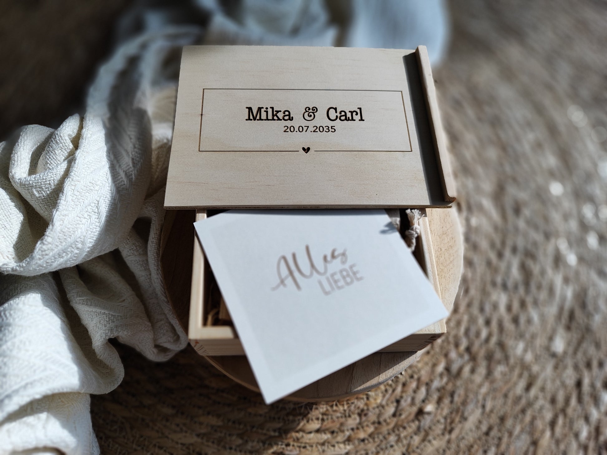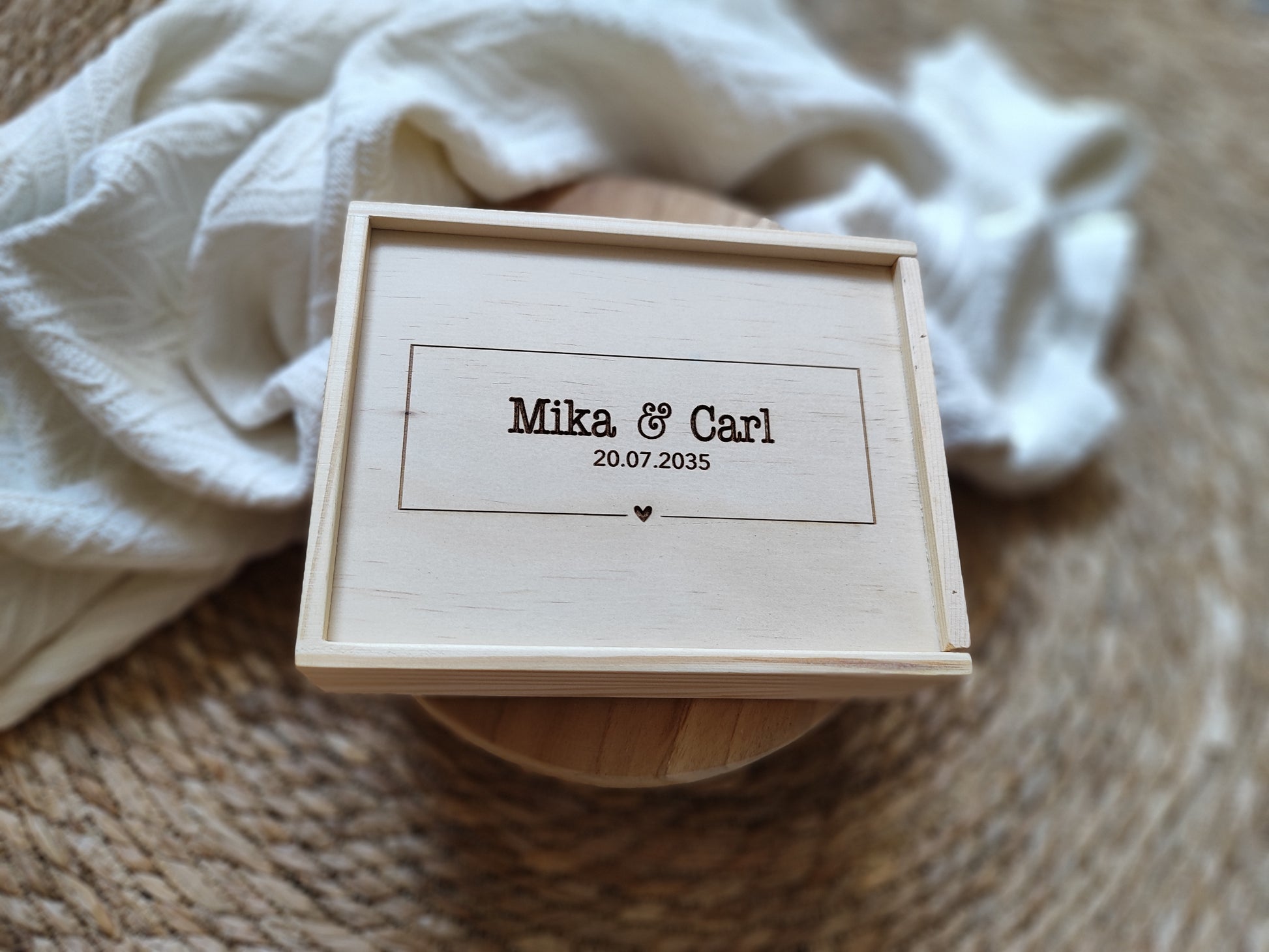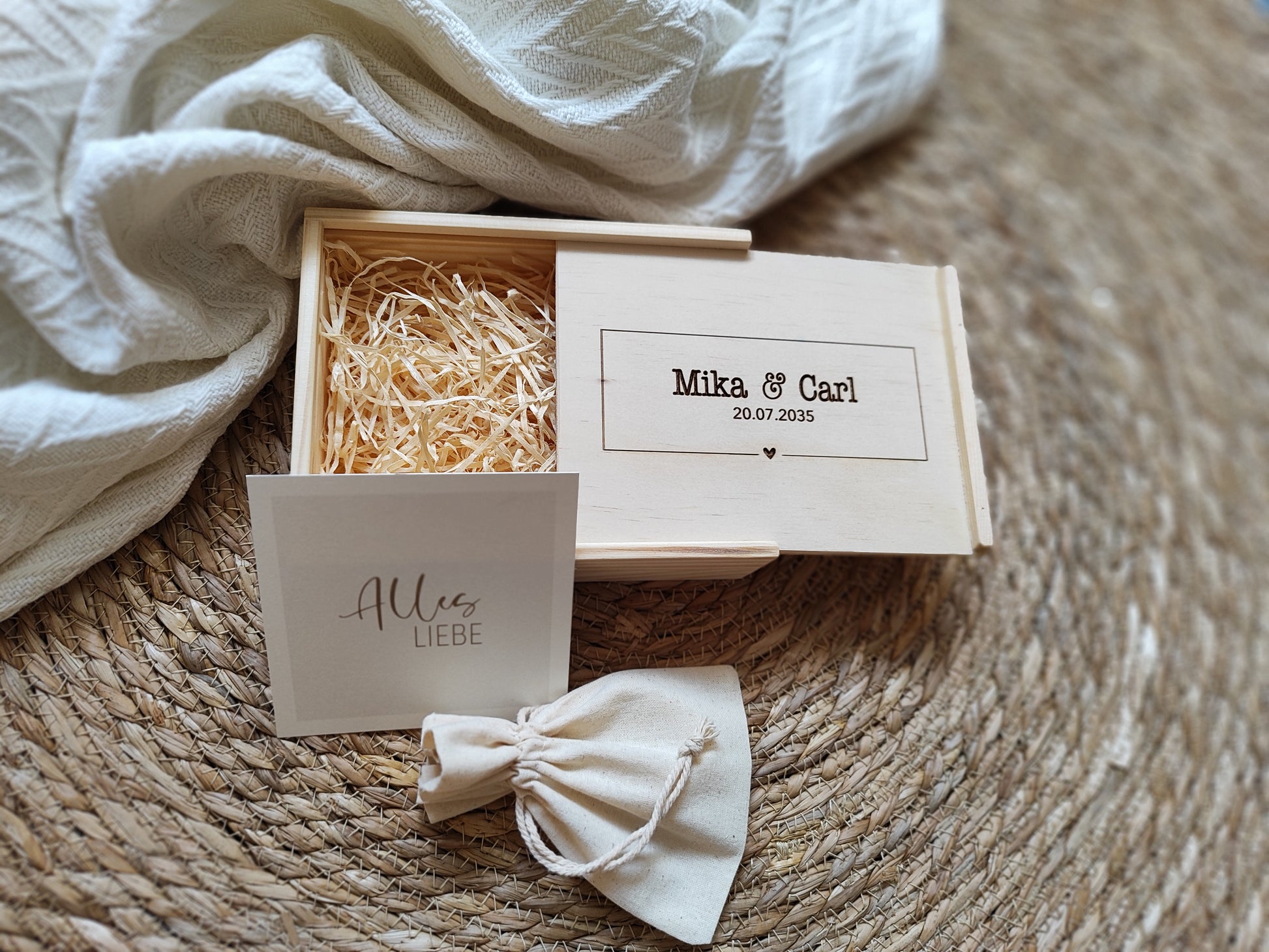 Du verschenkst nicht einfach nur eine Box, sondern ein echtes Unikat. Jede einzelne entsteht aus natürlichem Kiefernholz und ist durch ihre individuelle Maserung, Farbgebung und kleine Asteinschlüsse einzigartig. Deine Personalisierung und unsere eigenen liebevollen Illustrationen machen sie zu einem besonderen Einzelstück mit bleibendem Wert.
