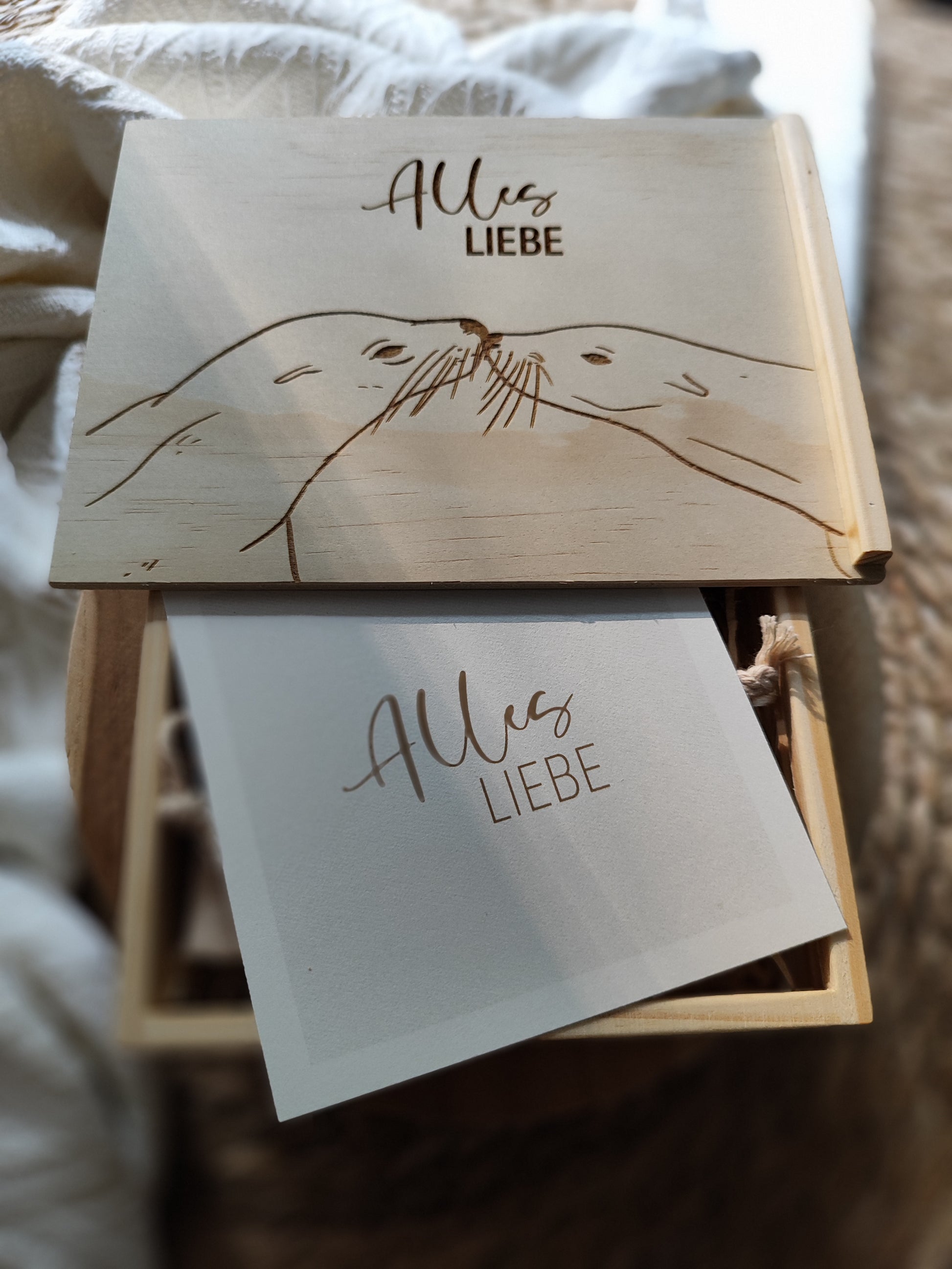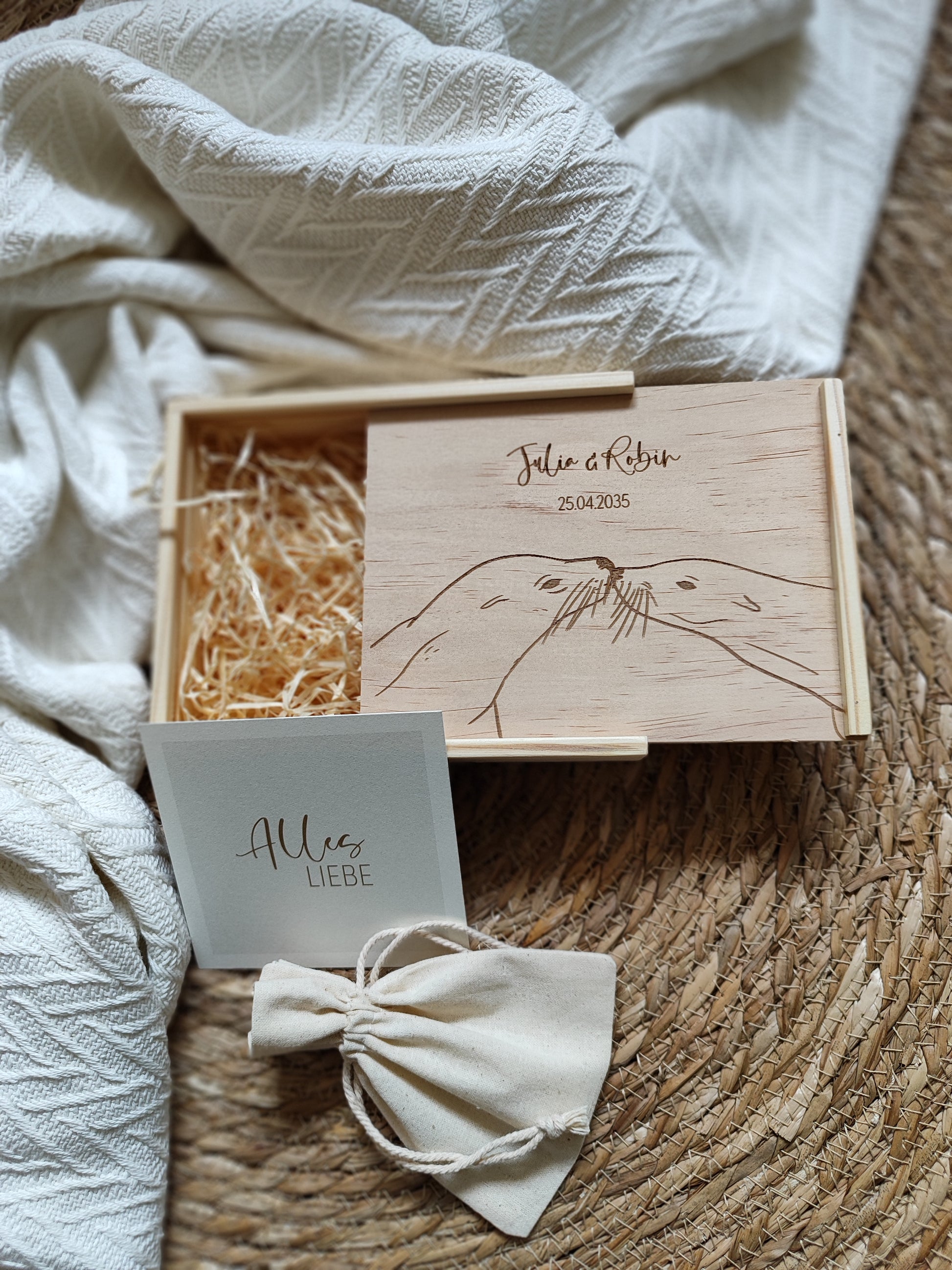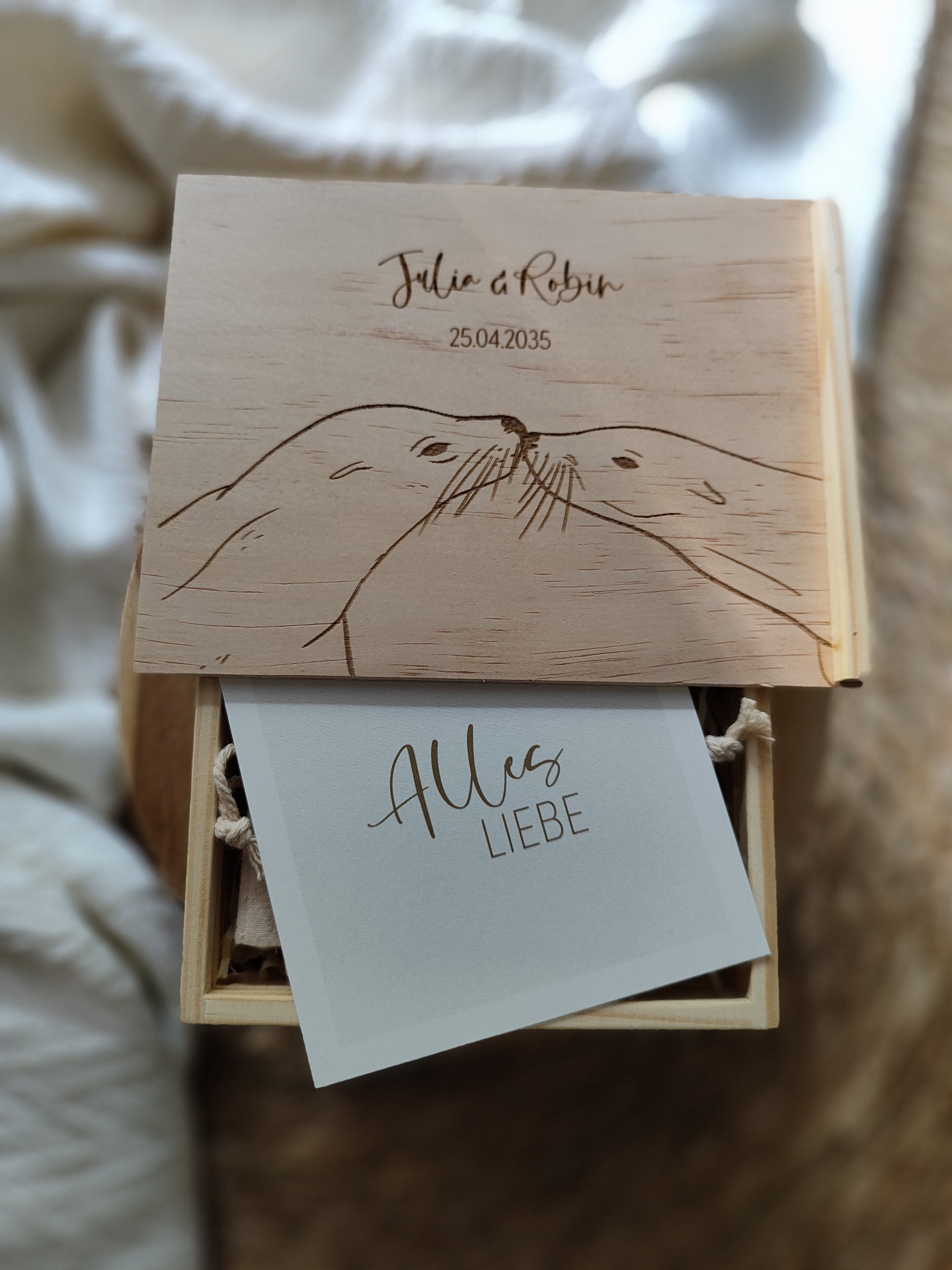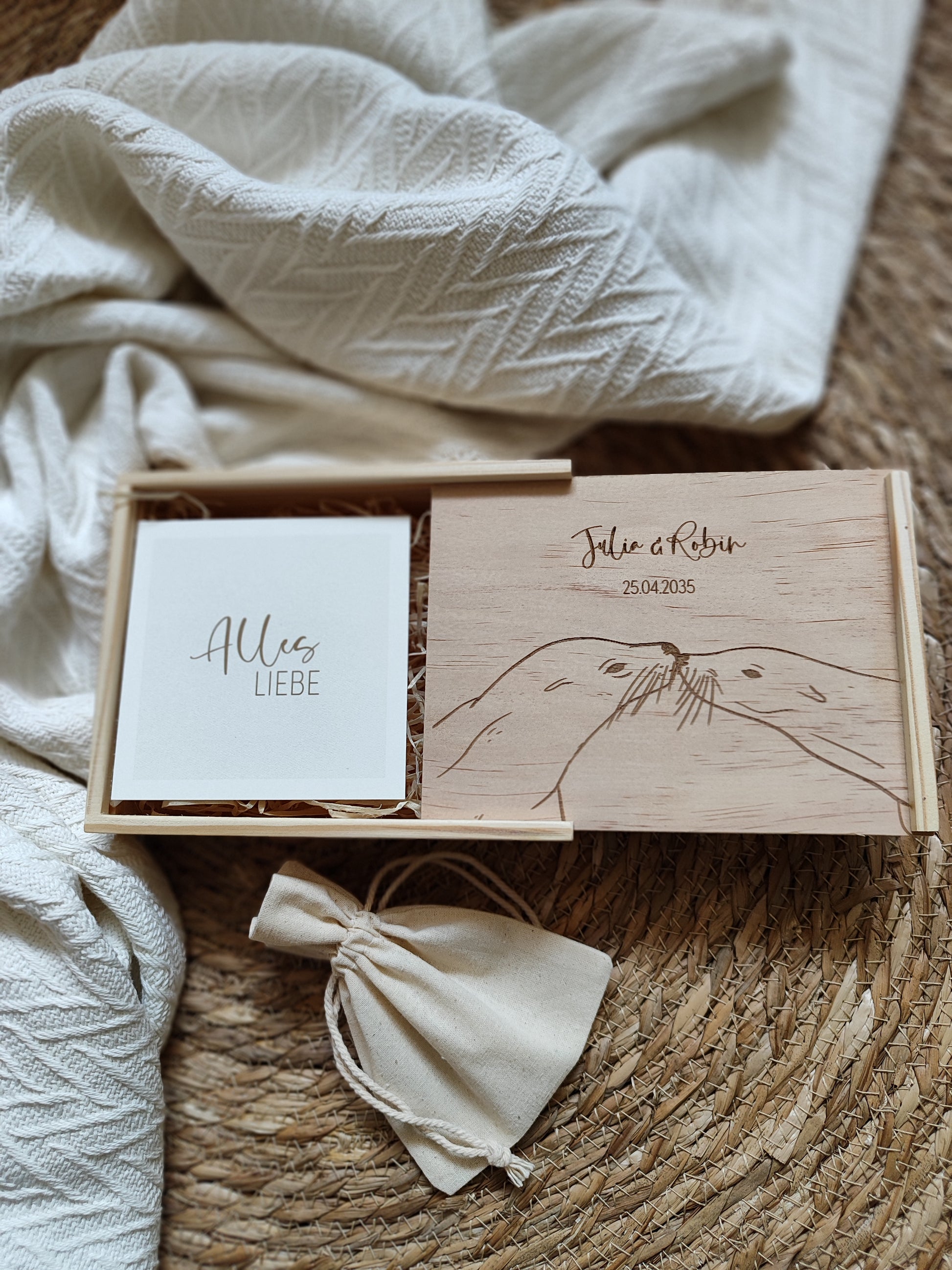 Du verschenkst nicht einfach nur eine Box, sondern ein echtes Unikat. Jede einzelne entsteht aus natürlichem Kiefernholz und ist durch ihre individuelle Maserung, Farbgebung und kleine Asteinschlüsse einzigartig. Deine Personalisierung und unsere eigenen liebevollen Illustrationen machen sie zu einem besonderen Einzelstück mit bleibendem Wert.