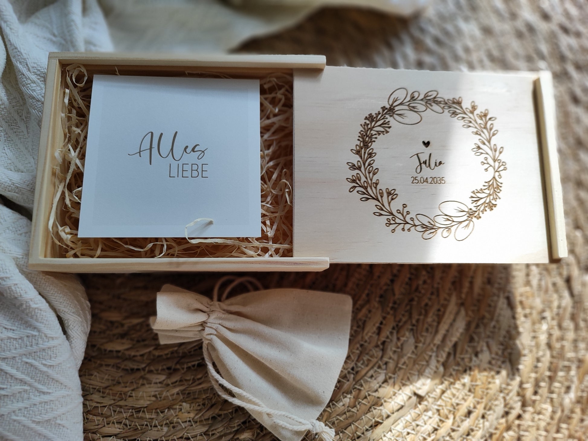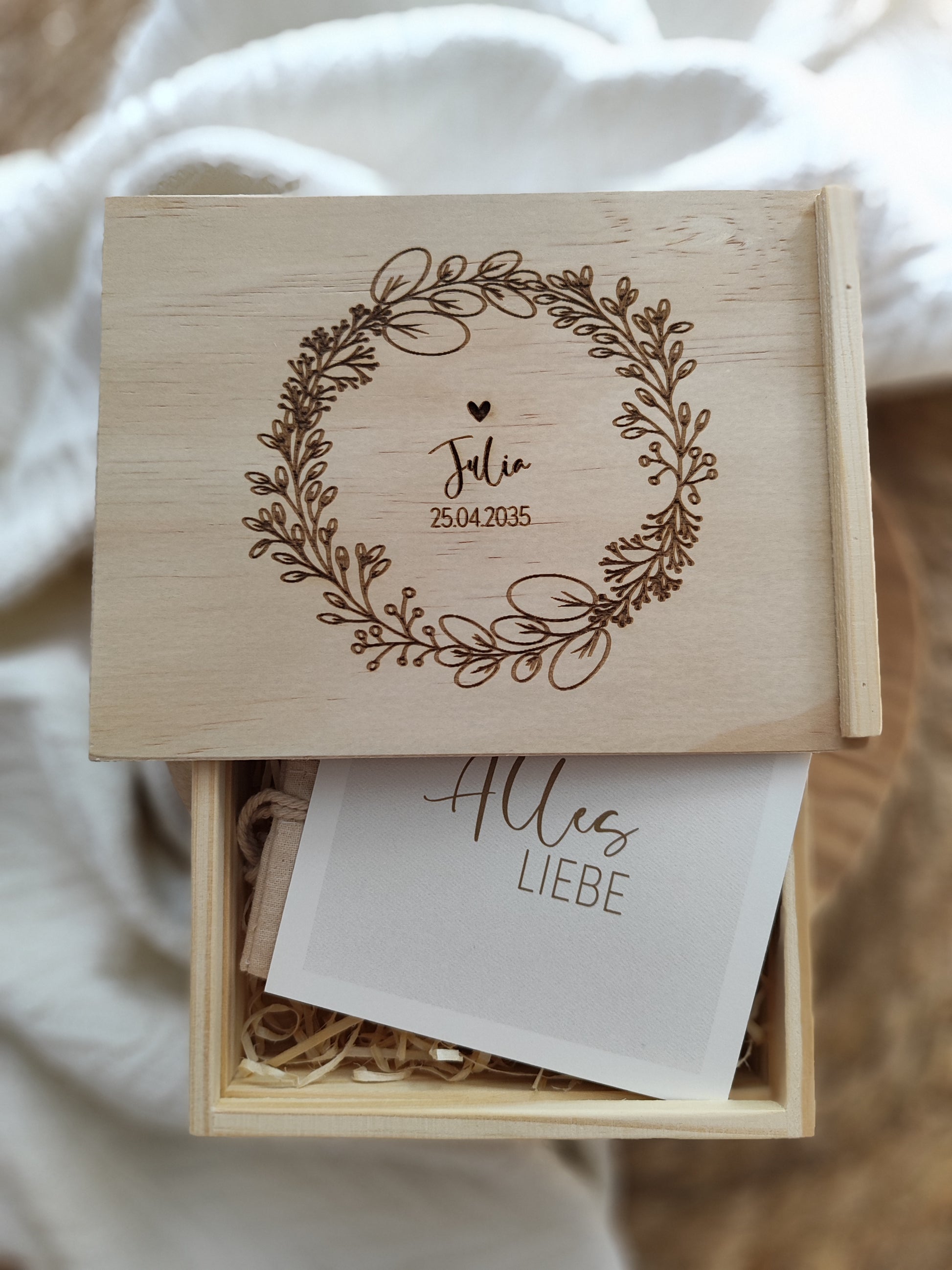 - 1x Holzschiebebox, Design wie abgebildet, Text: