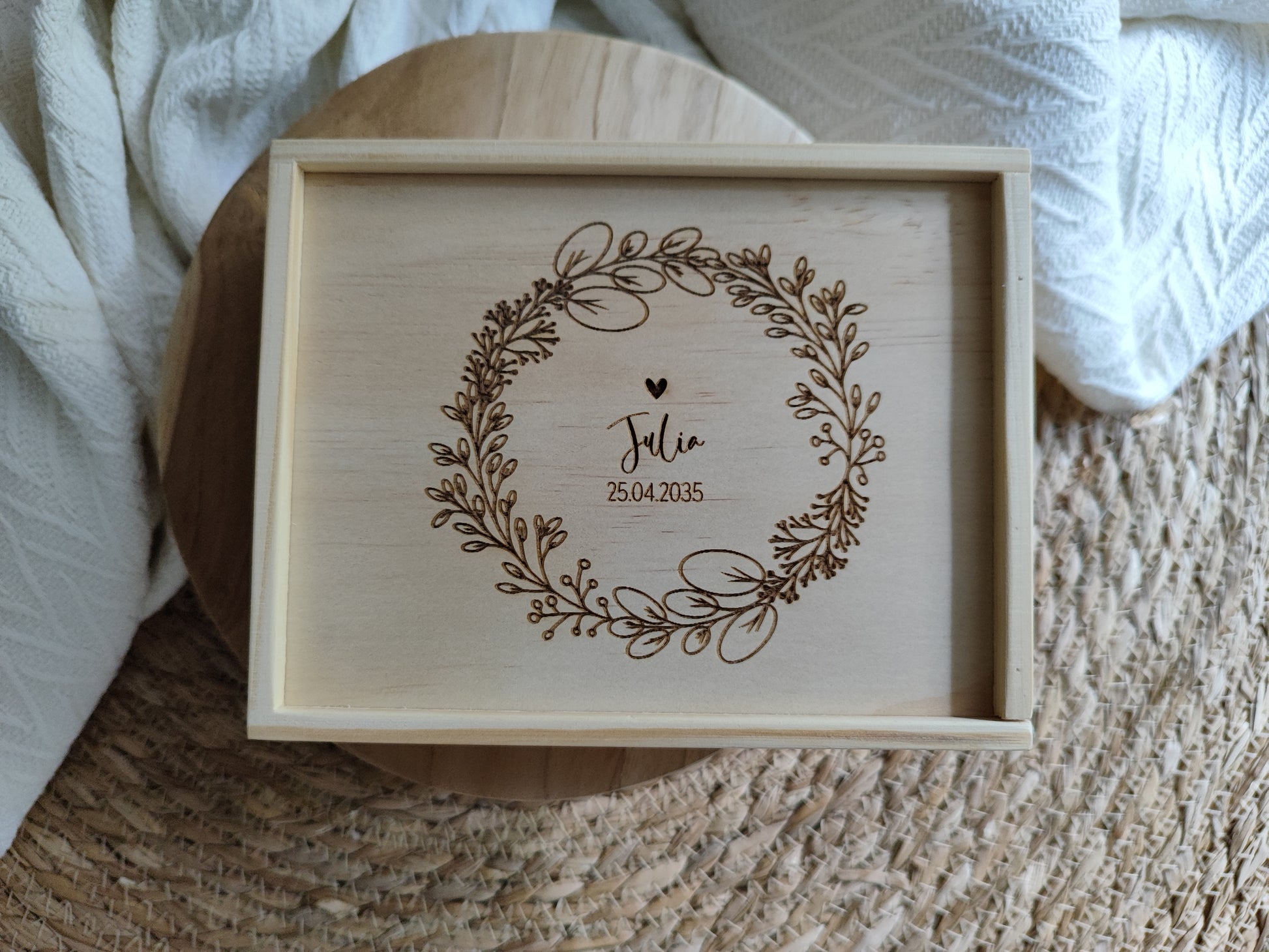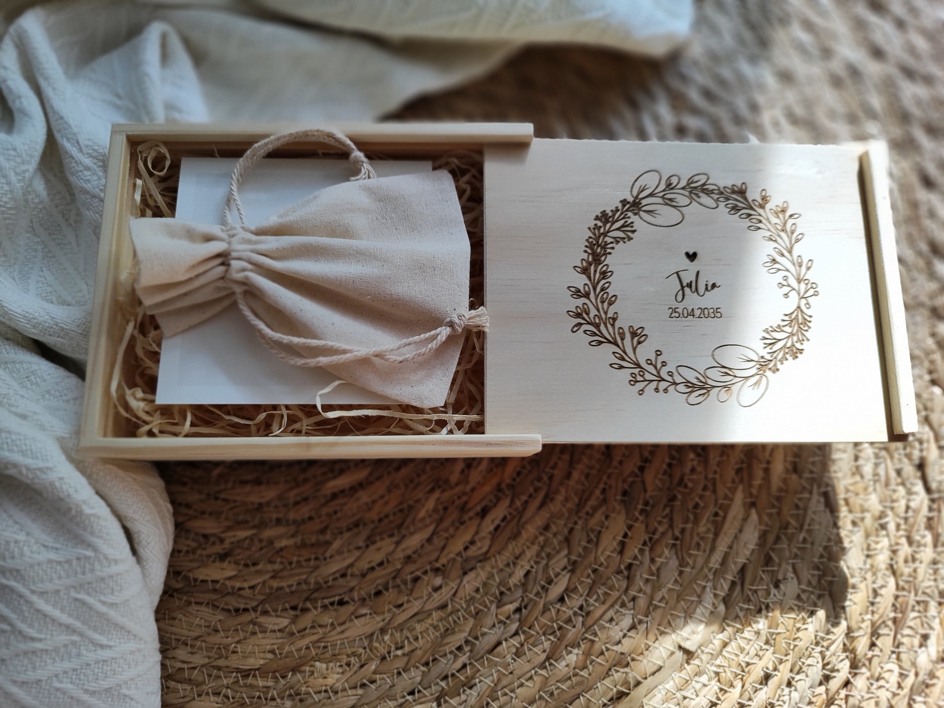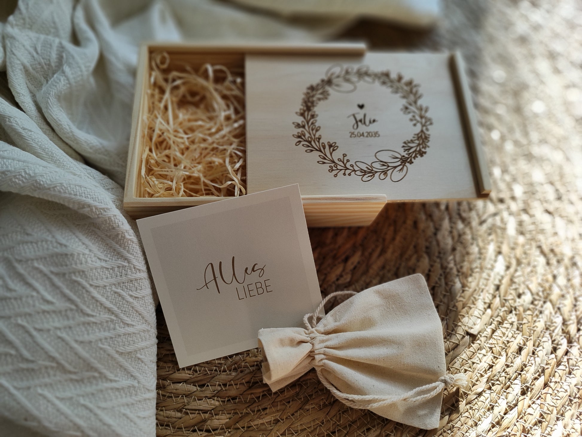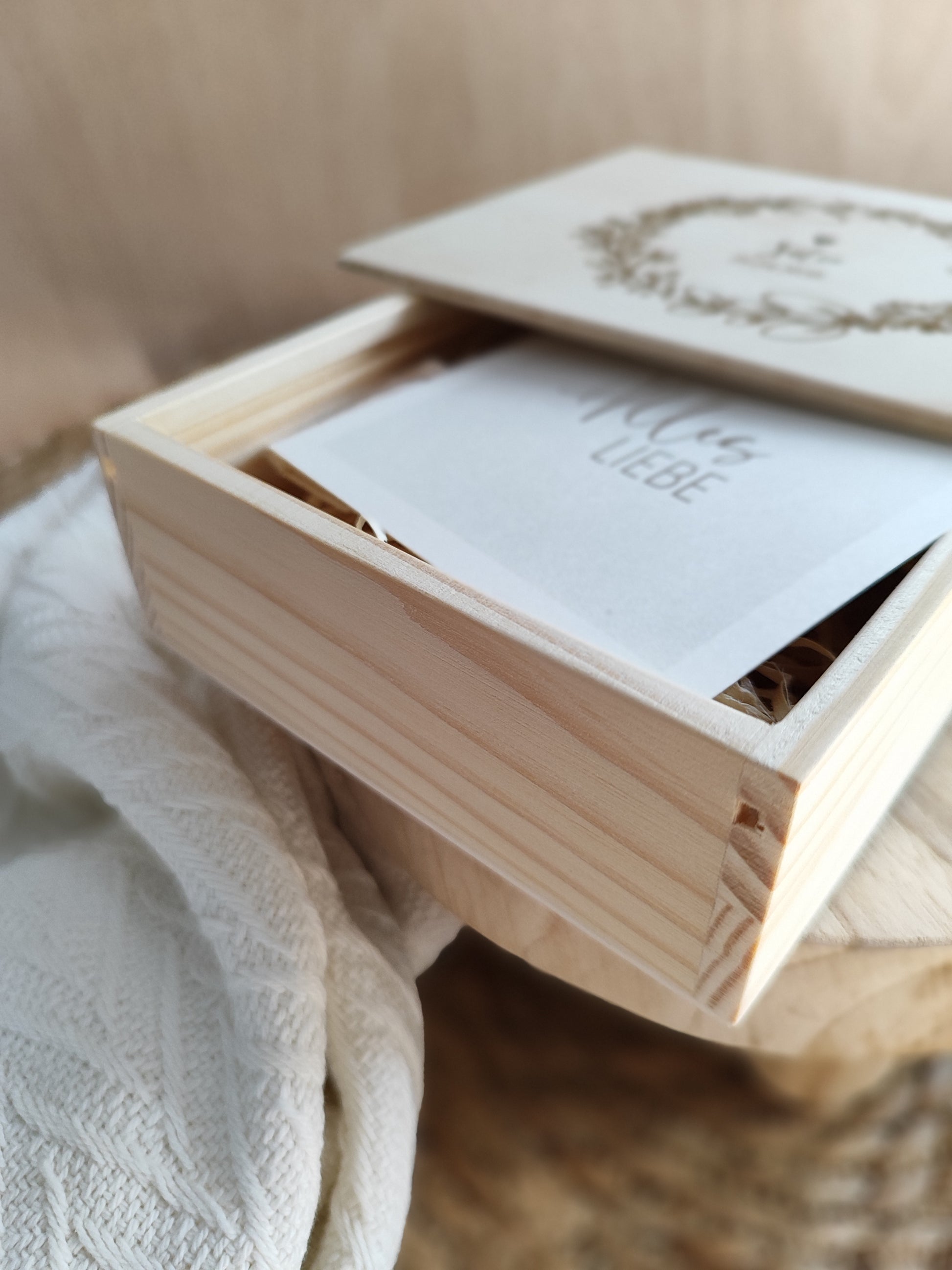 Du verschenkst nicht einfach nur eine Box, sondern ein echtes Unikat. Jede einzelne entsteht aus natürlichem Kiefernholz und ist durch ihre individuelle Maserung, Farbgebung und kleine Asteinschlüsse einzigartig. Deine Personalisierung und unsere eigenen liebevollen Illustrationen machen sie zu einem besonderen Einzelstück mit bleibendem Wert.