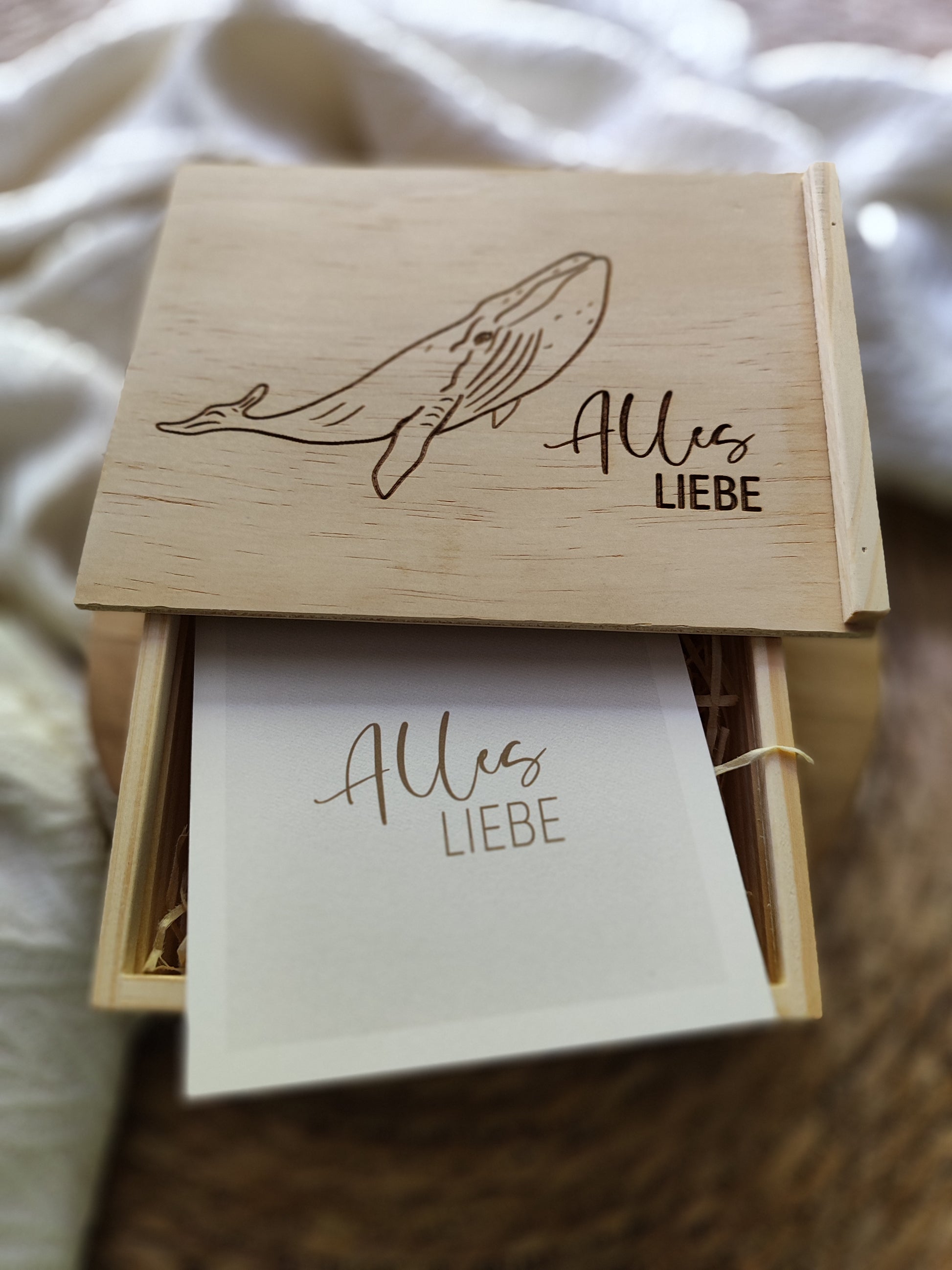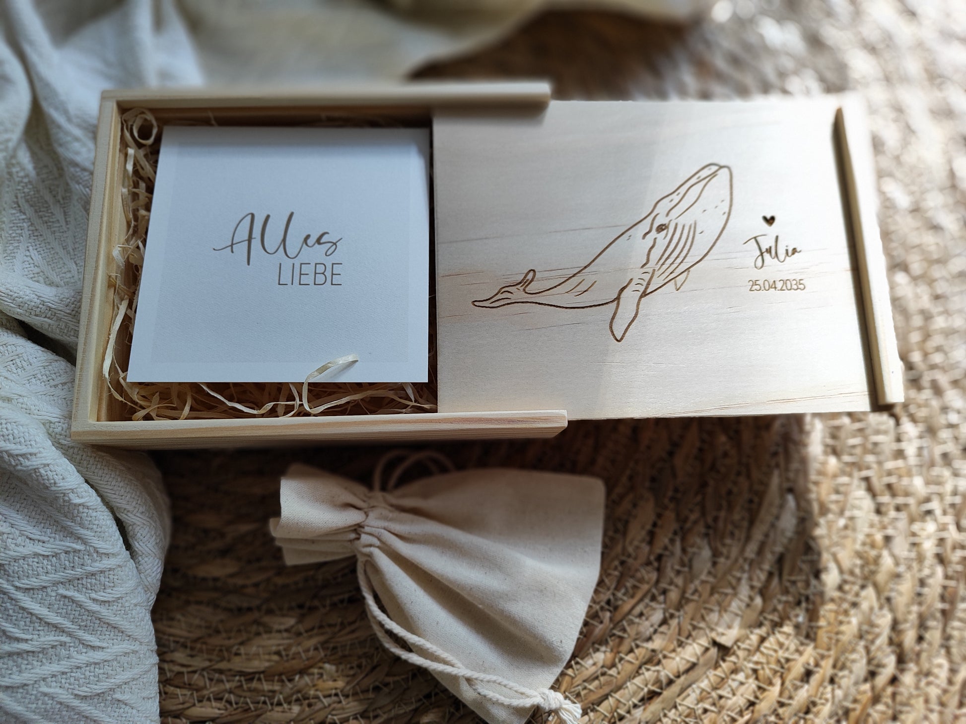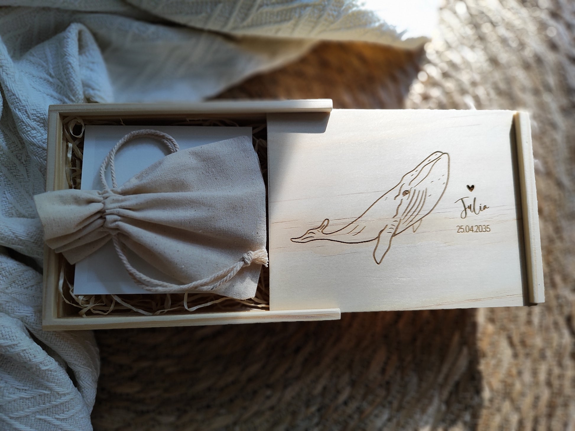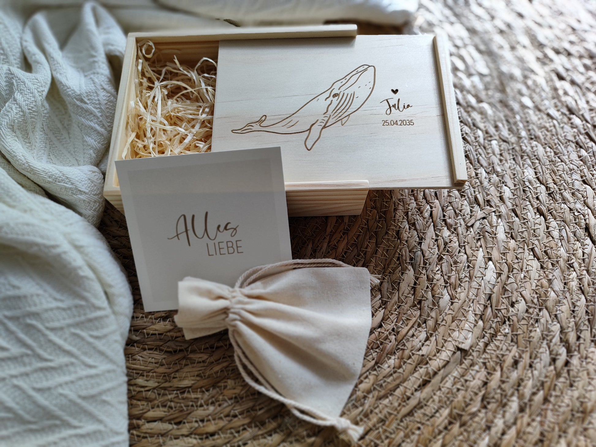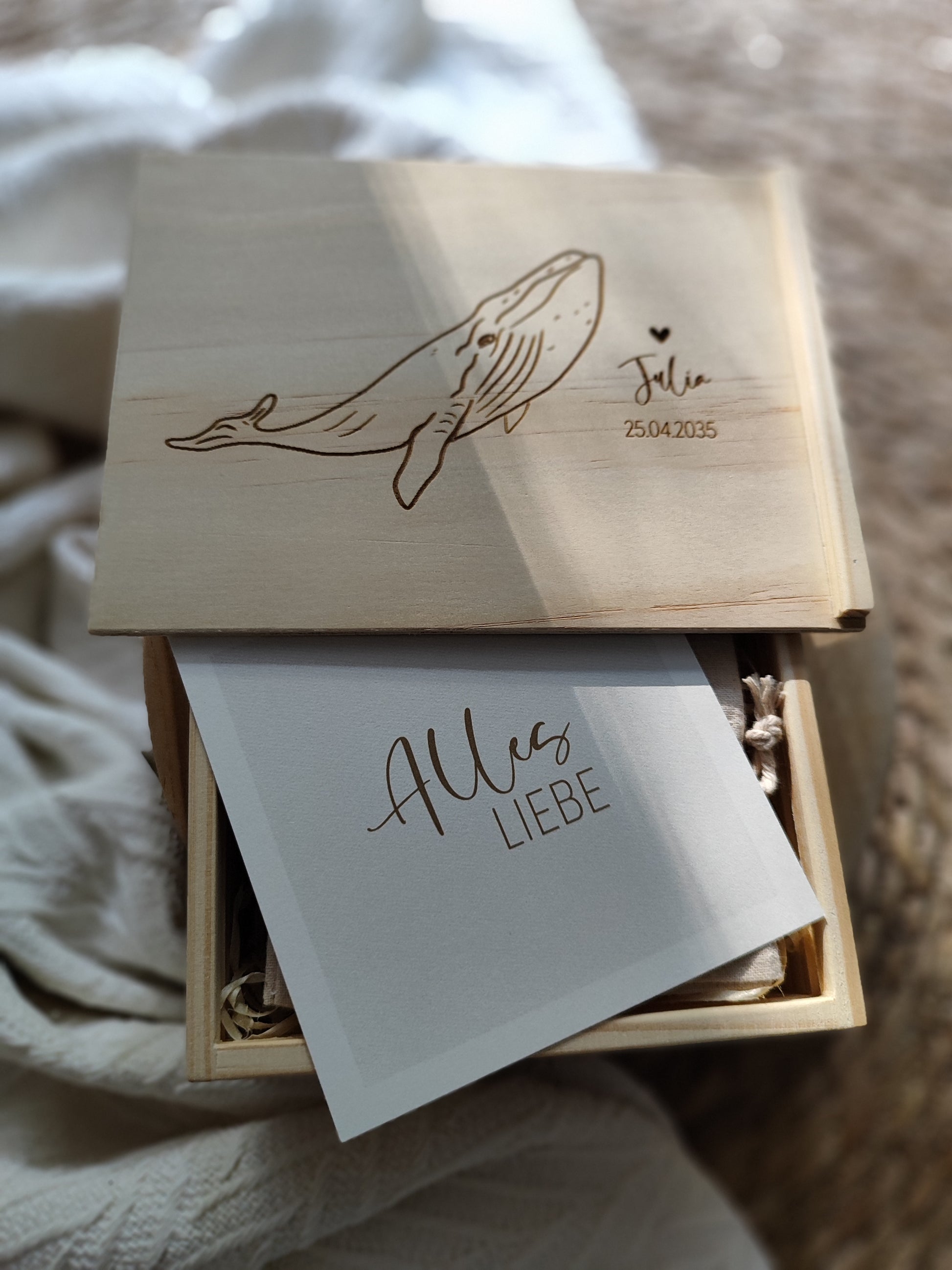 Du verschenkst nicht einfach nur eine Box, sondern ein echtes Unikat. Jede einzelne entsteht aus natürlichem Kiefernholz und ist durch ihre individuelle Maserung, Farbgebung und kleine Asteinschlüsse einzigartig. Deine Personalisierung und unsere eigenen liebevollen Illustrationen machen sie zu einem besonderen Einzelstück mit bleibendem Wert.
