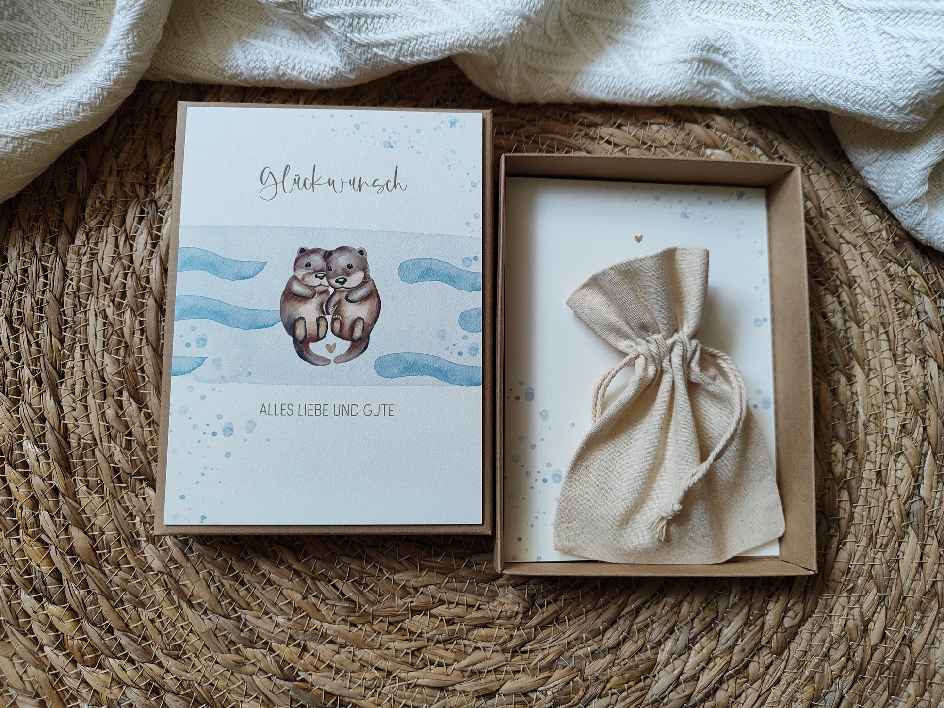 Die Karte in der Box ist herausnehmbar und bietet Platz auf der Vor- und Rückseite für einen eigenen Text.