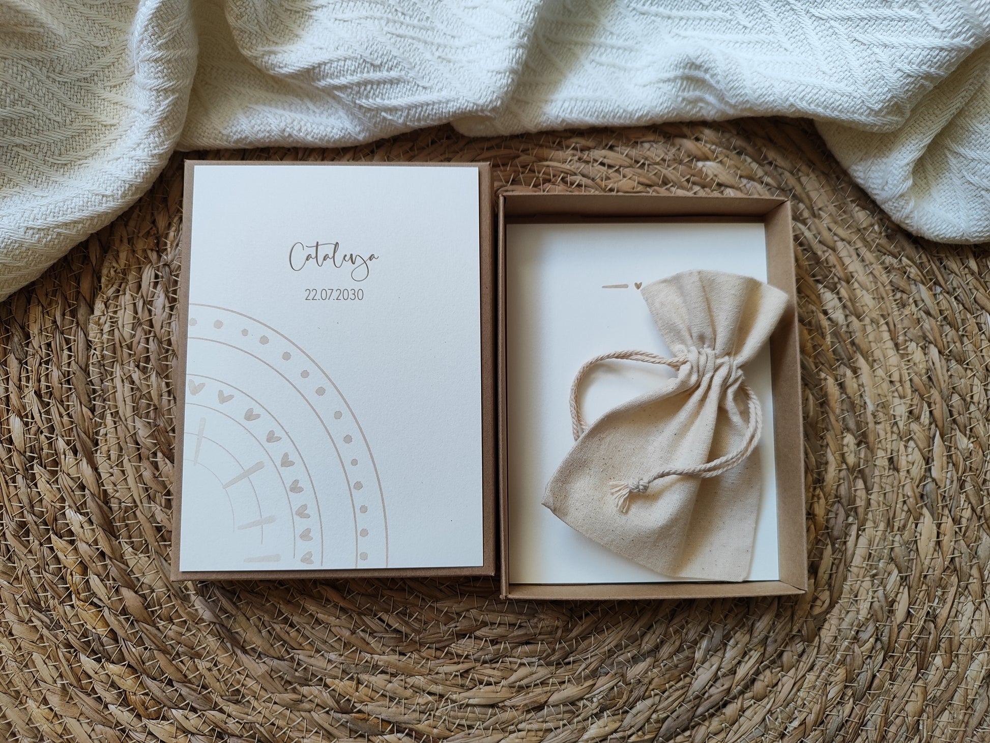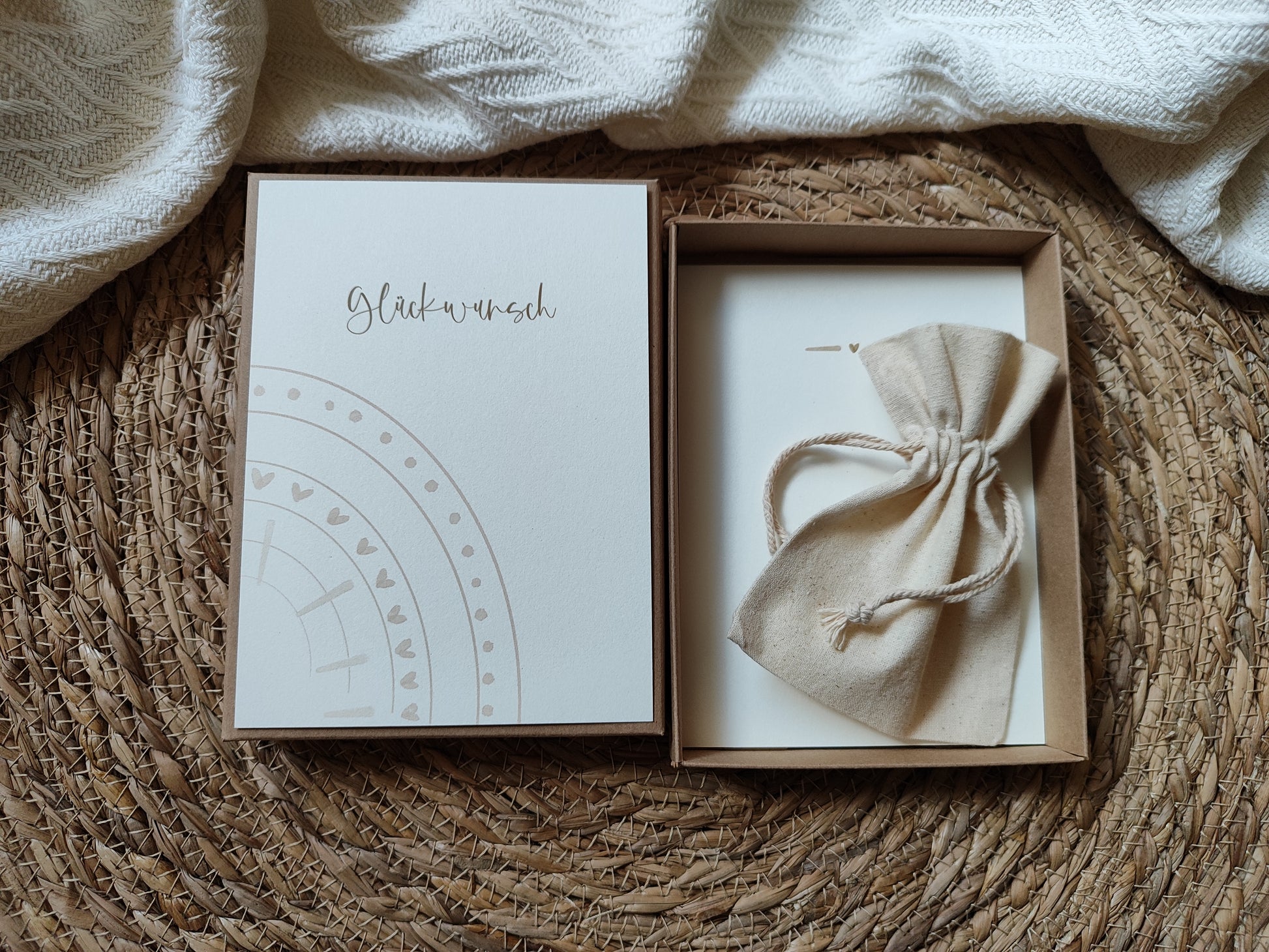 Die Karte in der Box ist herausnehmbar und bietet Platz auf der Vor- und Rückseite für einen eigenen Text.