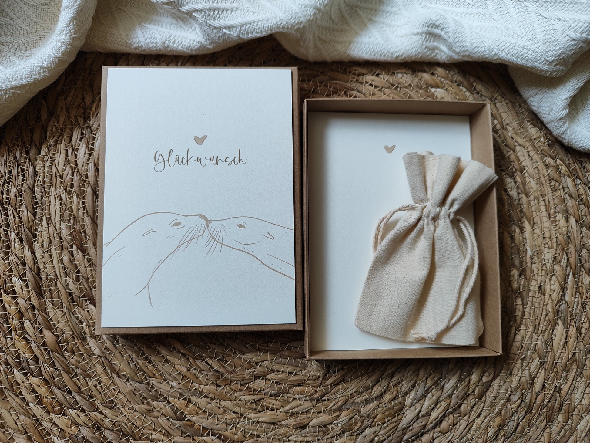 Die Karte in der Box ist herausnehmbar und bietet Platz auf der Vor- und Rückseite für einen eigenen Text.