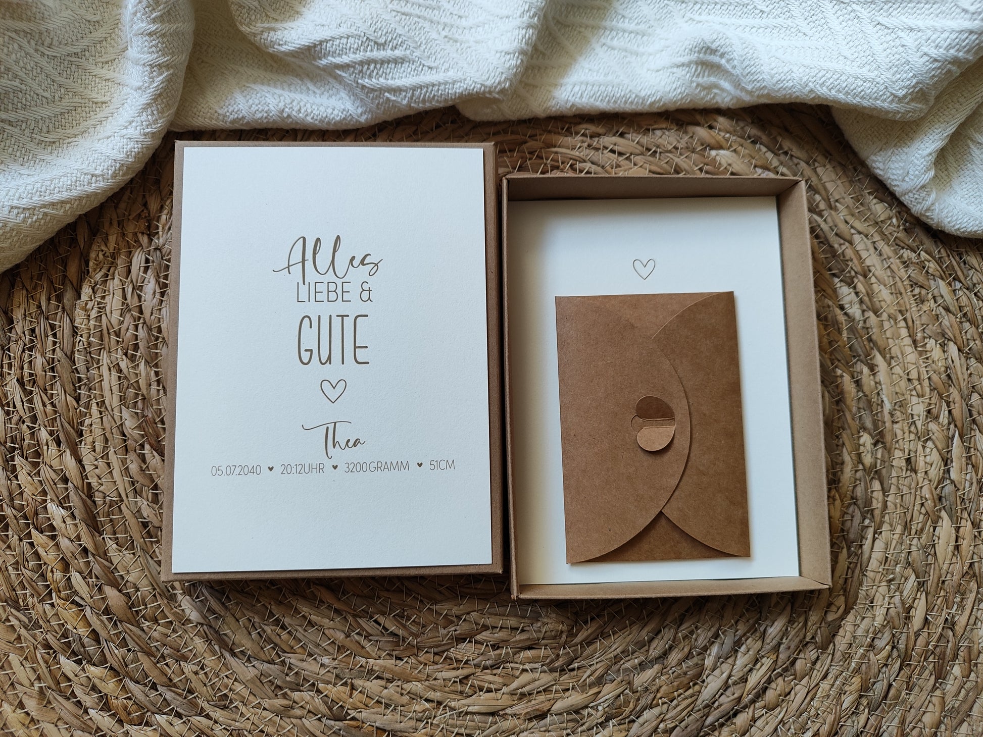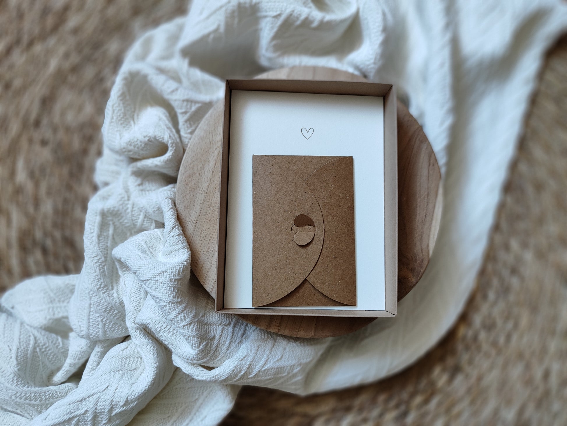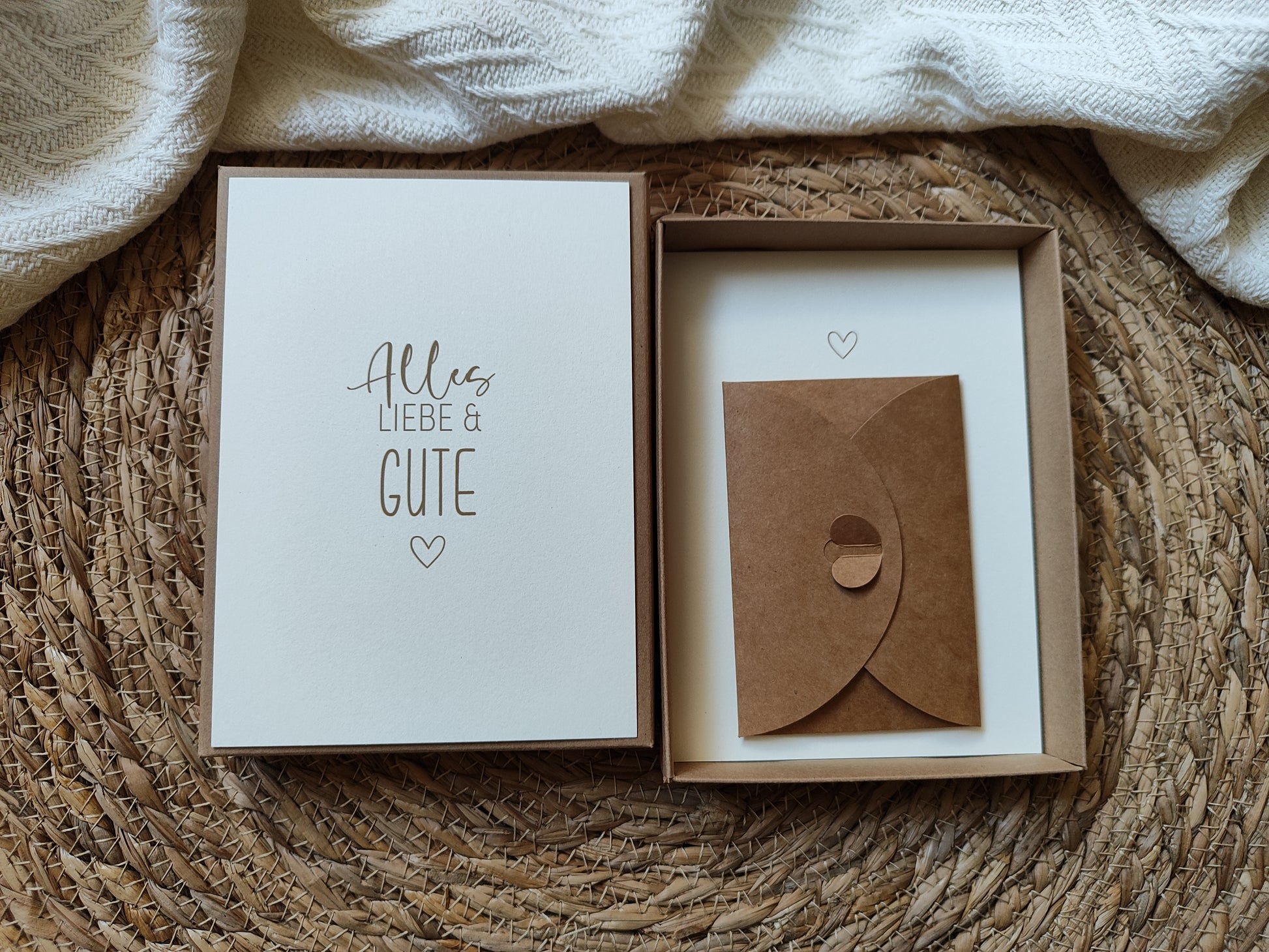 Die Karte in der Box ist herausnehmbar und bietet Platz auf der Vor- und Rückseite für einen eigenen Text.