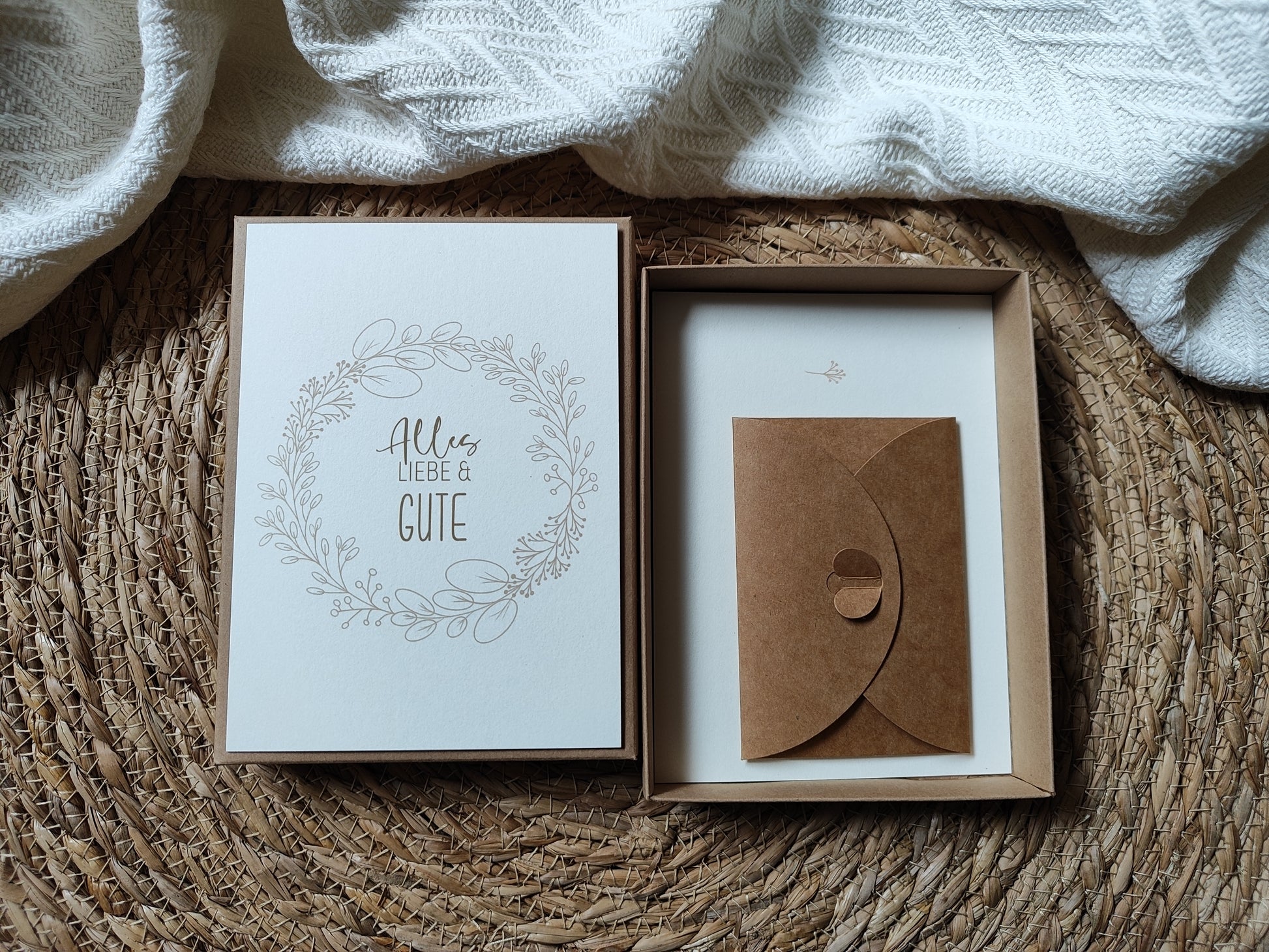 Die Karte in der Box ist herausnehmbar und bietet Platz auf der Vor- und Rückseite für einen eigenen Text.