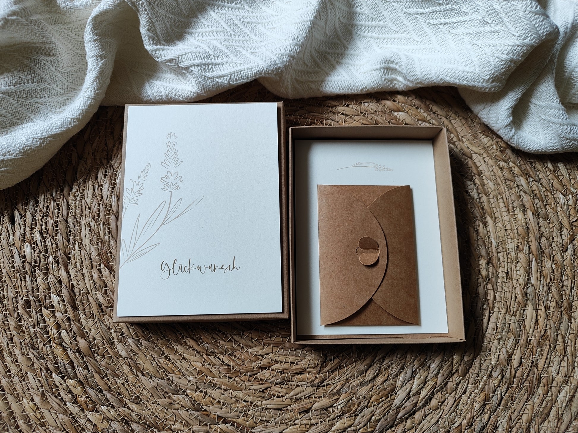 Die Karte in der Box ist herausnehmbar und bietet Platz auf der Vor- und Rückseite für einen eigenen Text.
