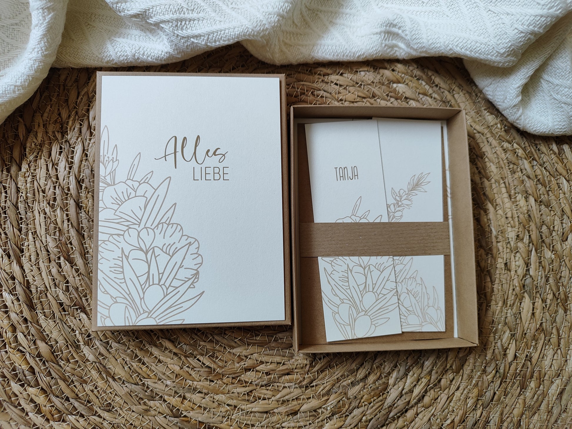 - 1x Kraftkartongeschenkbox + 2x Postkarte (Deckel Außen, Innen)
