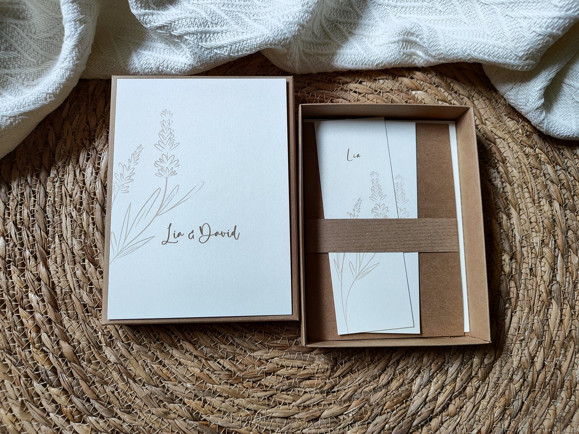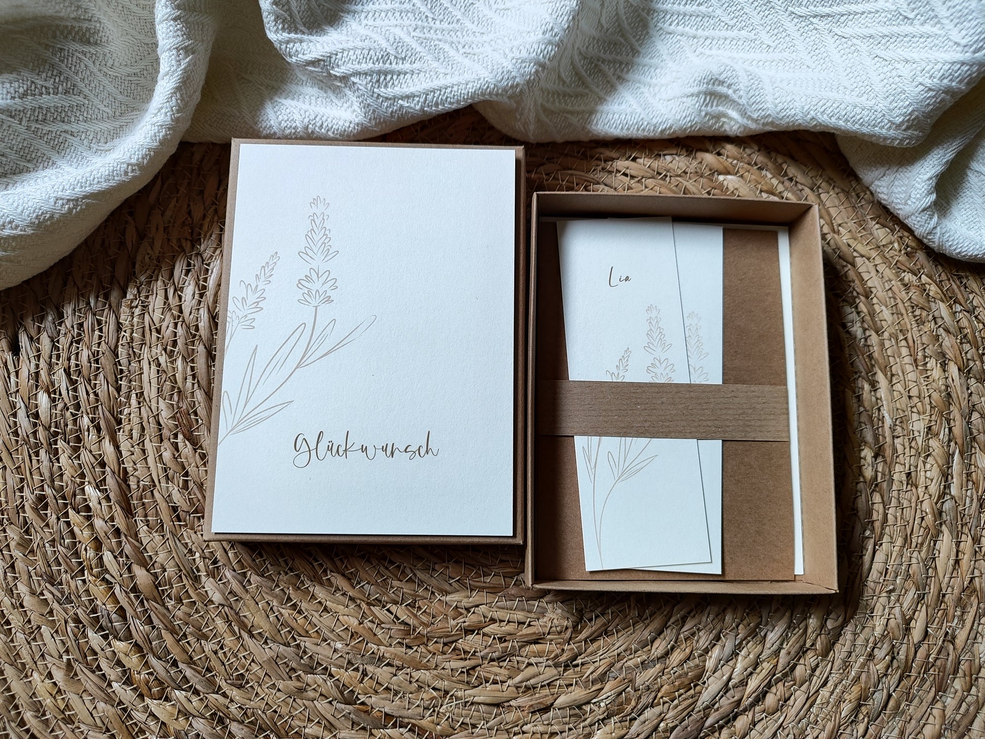 - 1x Kraftkartongeschenkbox + 2x Postkarte (Deckel Außen, Innen)
