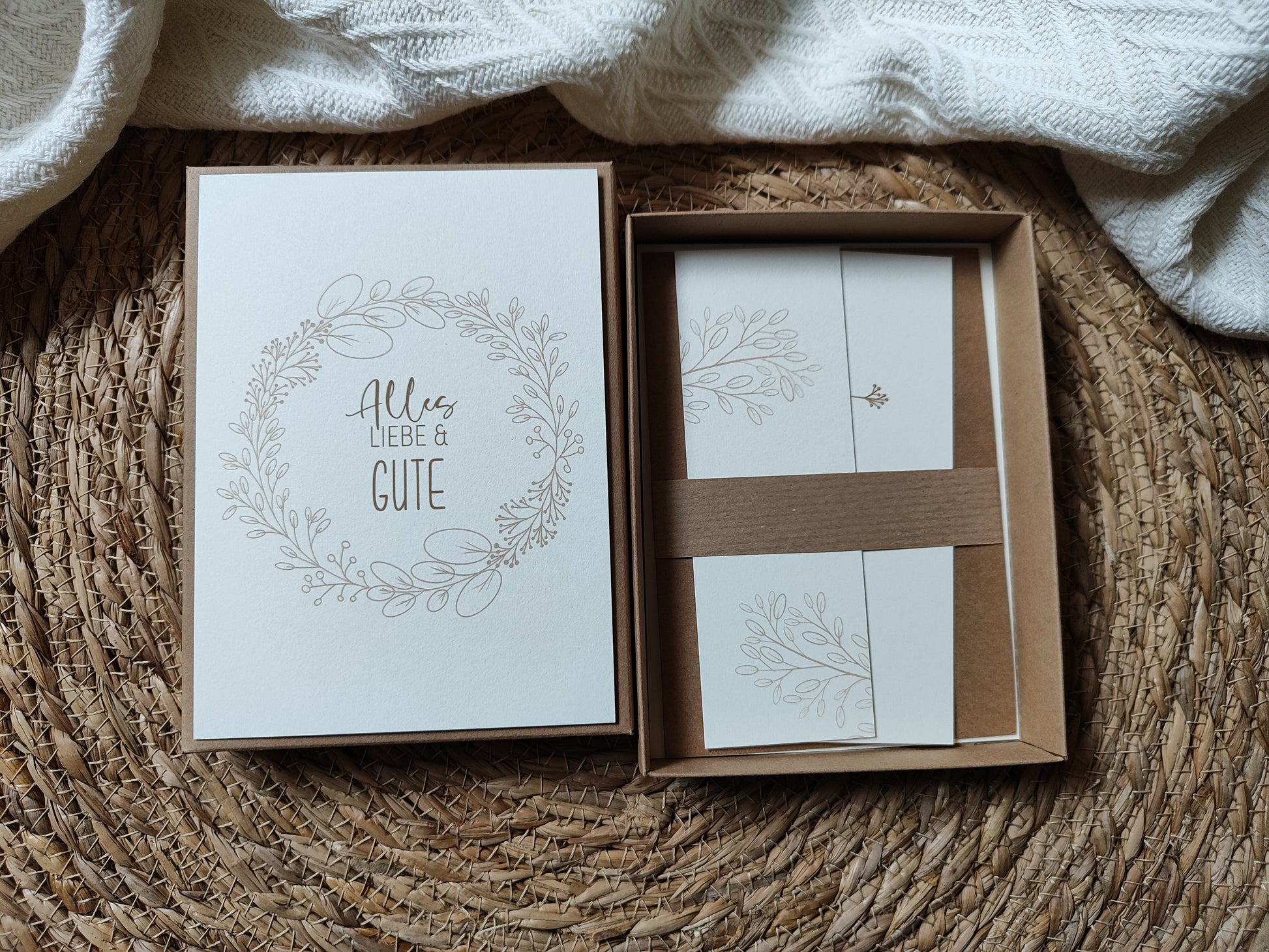 - 1x Kraftkartongeschenkbox + 2x Postkarte (Deckel Außen, Innen)