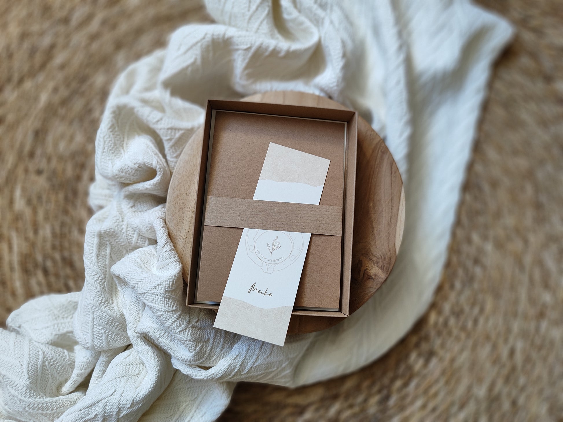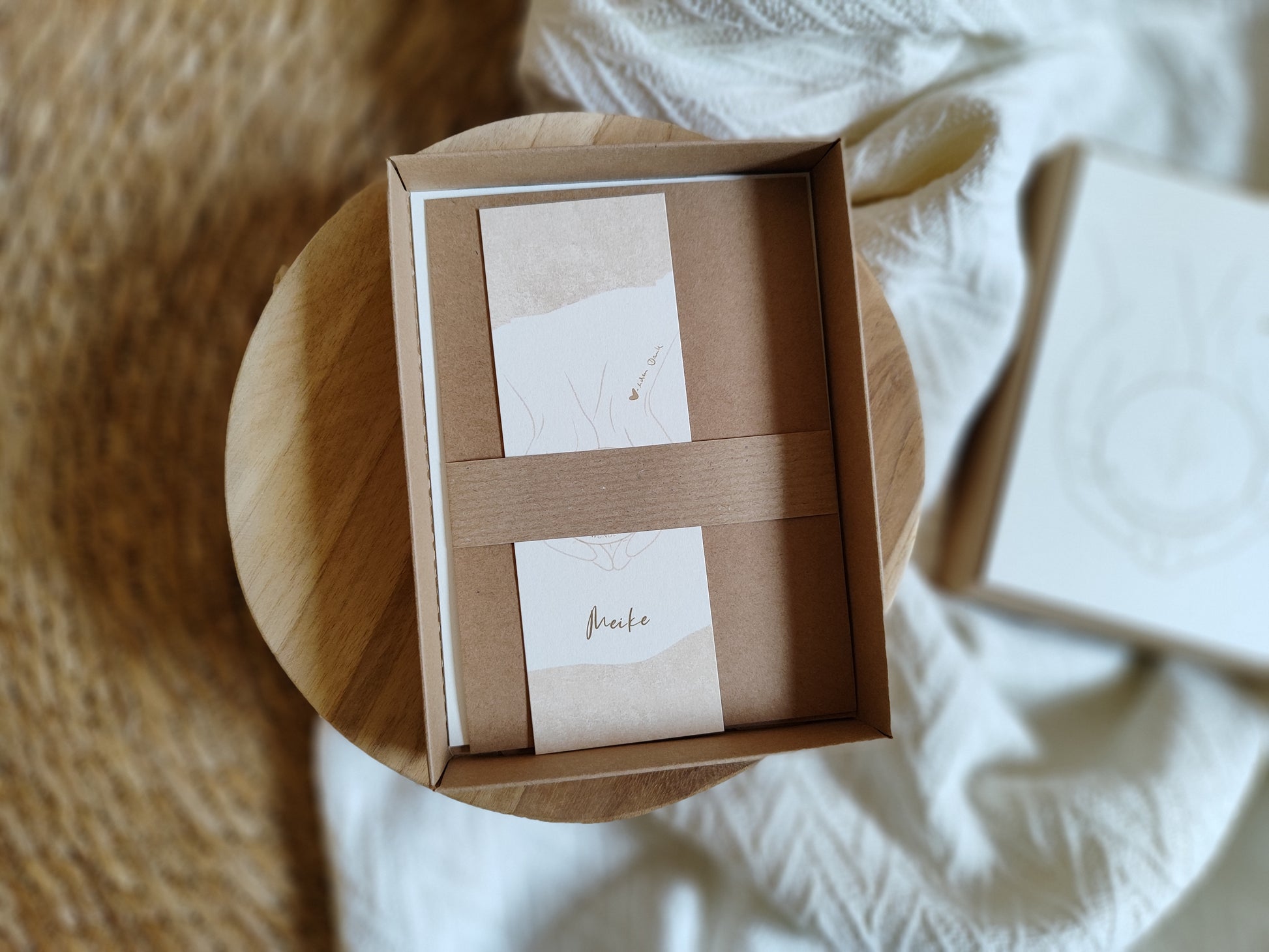 - 1x Kraftkartongeschenkbox + 2x Postkarte (Deckel Außen, Innen)